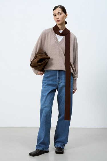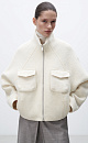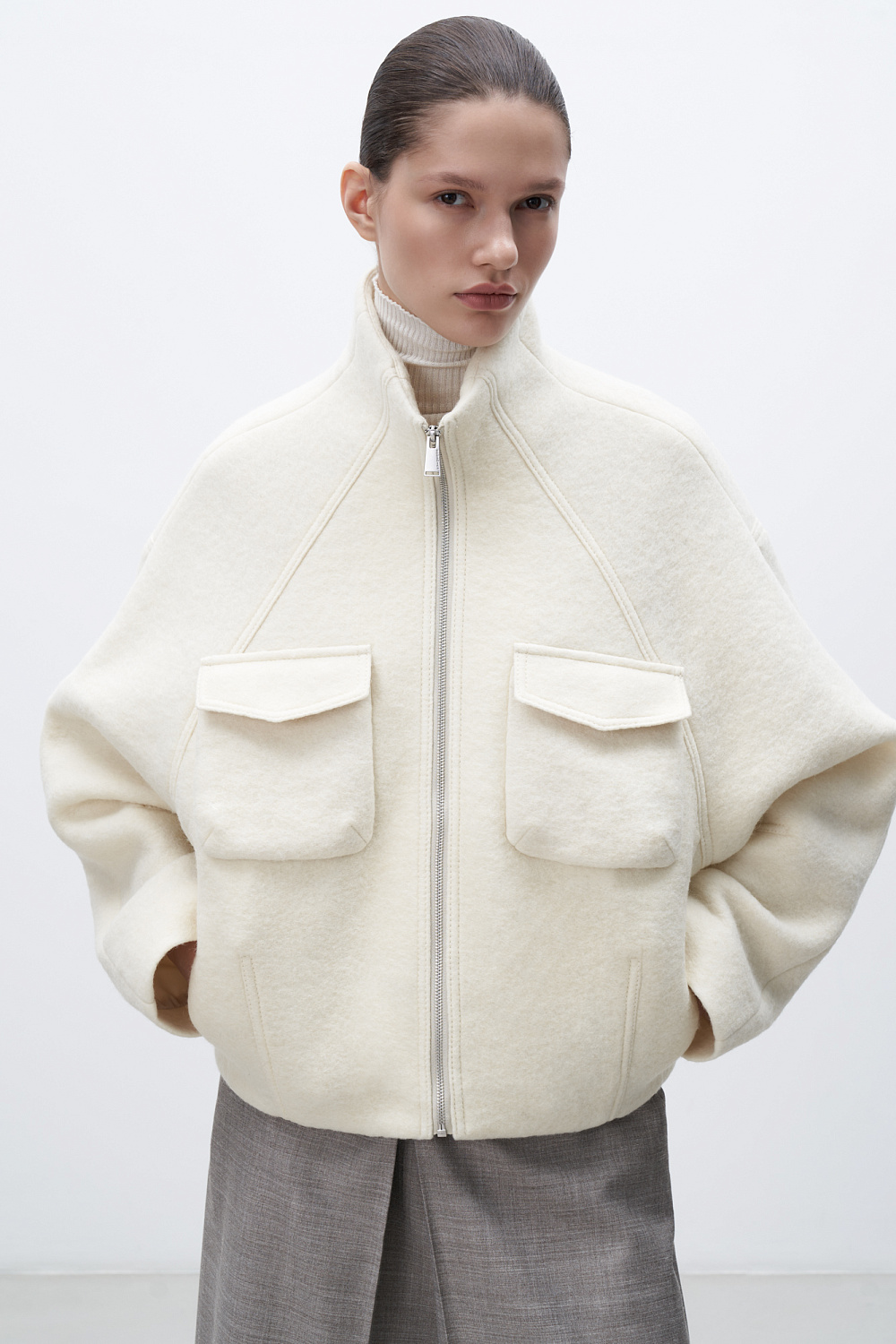 Wool jacket with raglan sleeves. The model has a loose silhouette with patch pockets on the chest and a one-piece stand-up collar. Zip closure. The product is lined.