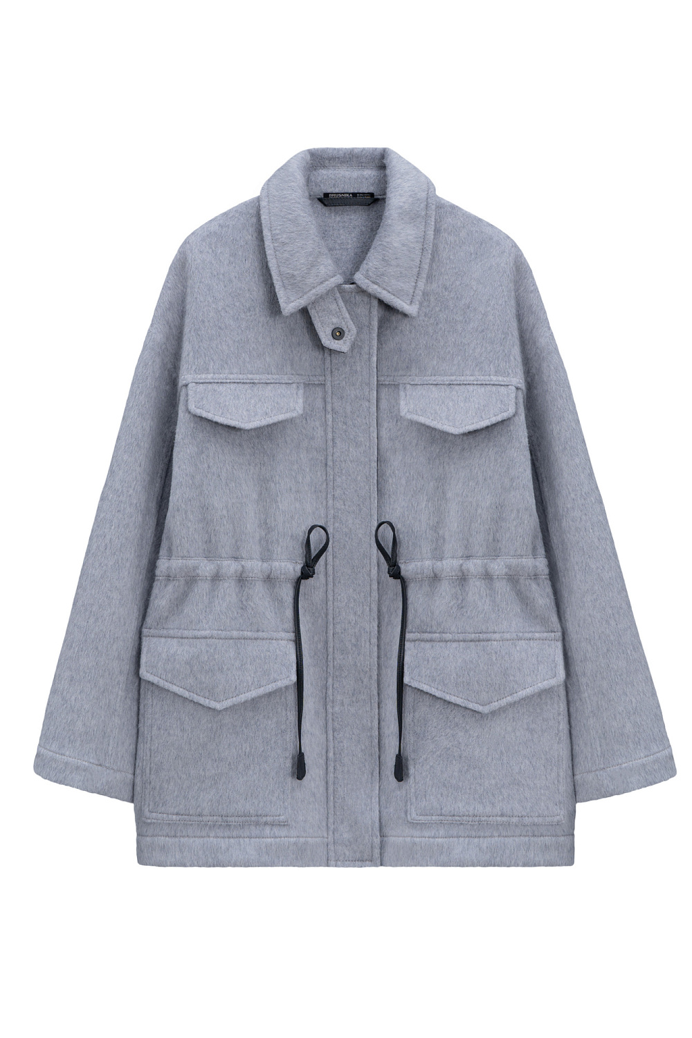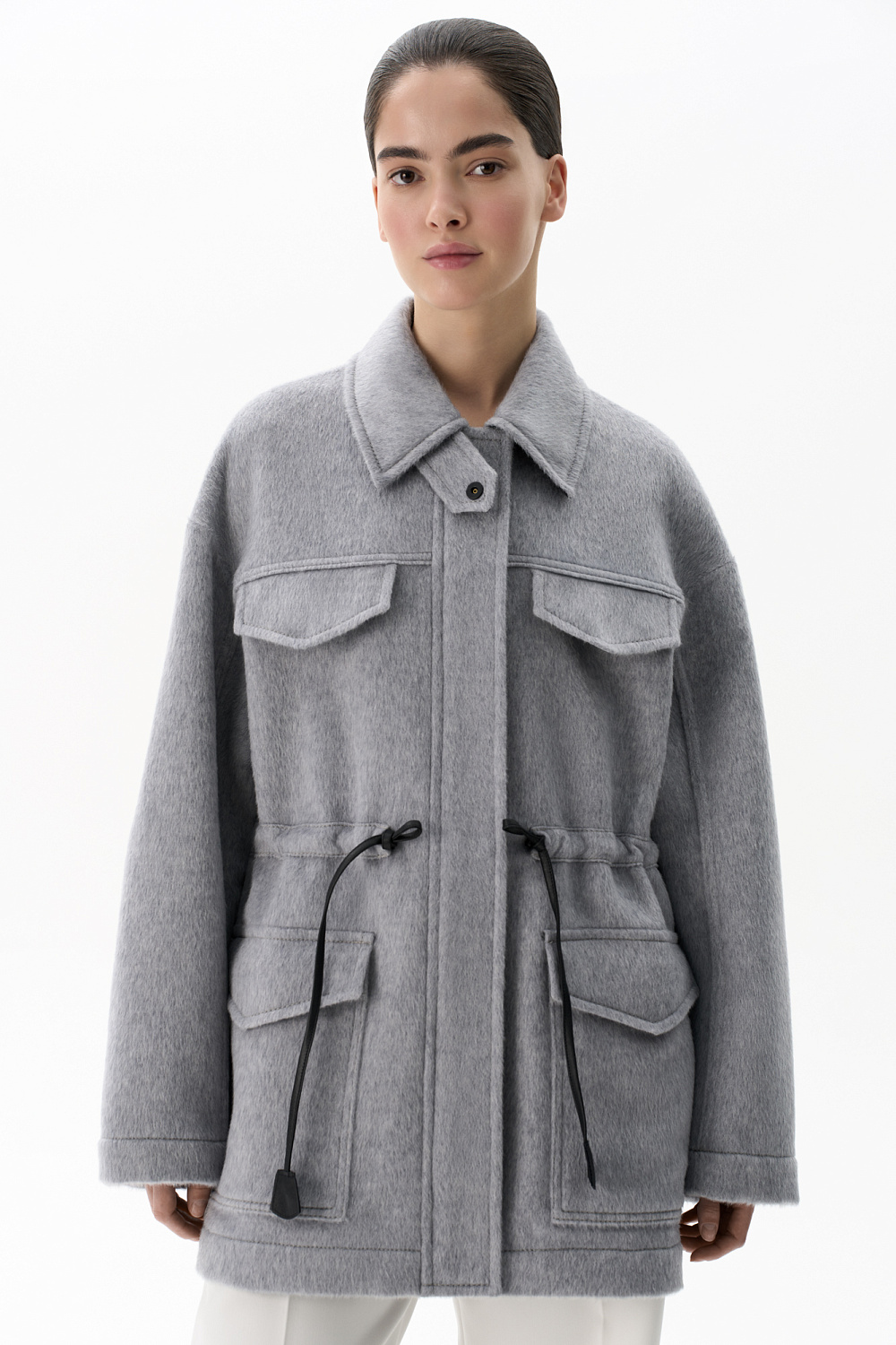 Jacket made of 100% wool. A loose-fitting model with a dropped shoulder line, an adjustable drawstring at the waist, and a turn-down collar with a pata. The product has patch pockets. It is fastened with a zipper and magnetic buttons under the placket.