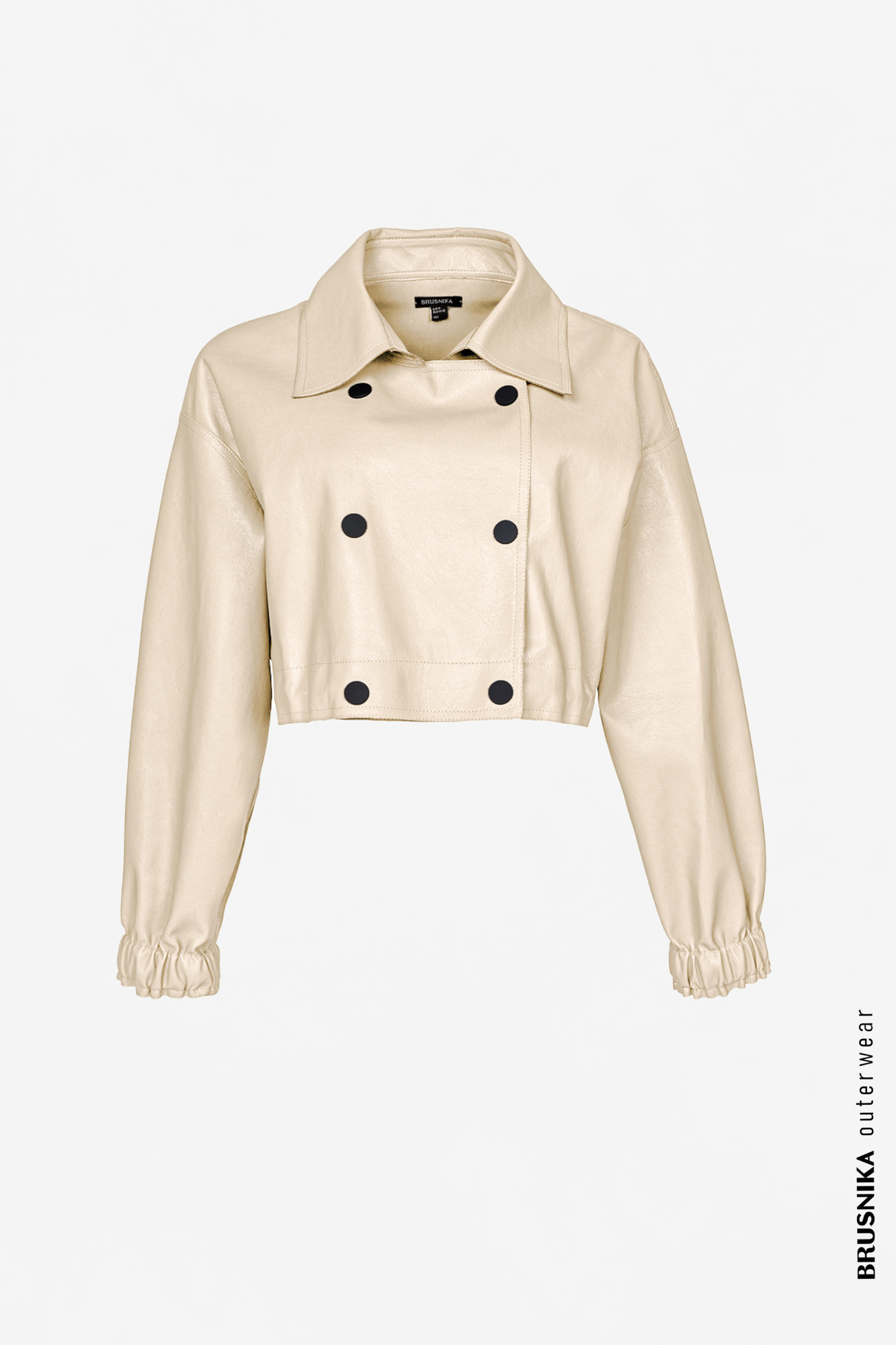 Short jacket made of lightweight faux leather with a classic collar and button closure. Adjustable drawstring at the bottom and elasticated cuffs.