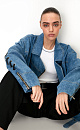 Oversized denim biker jacket with lace-up sleeves. Asymmetric zip fastening and buckle belt.