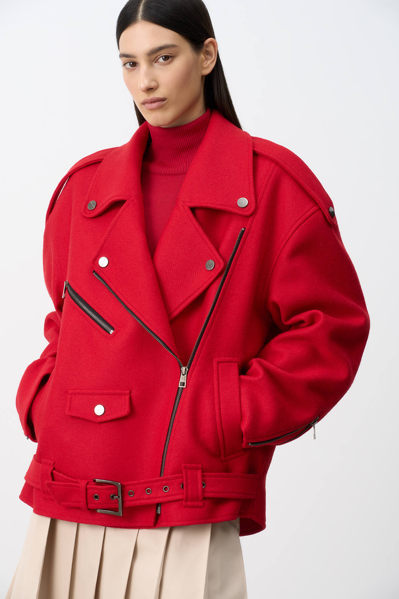 Wool-blend biker jacket with dropped shoulders, side pockets and epaulettes. Self-belt with metal buckle. Diagonal zip closure.