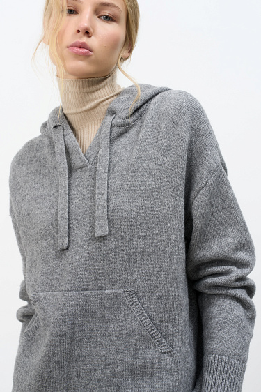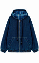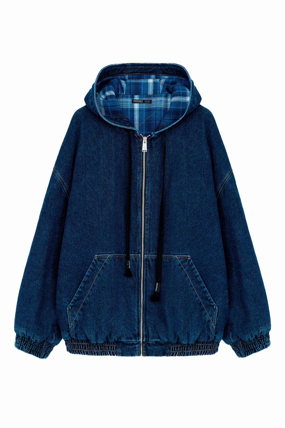 Denim jacket with drawstring hood. Loose silhouette model with dropped shoulders and side pockets. The cuffs and hem are elasticated. Lined.
