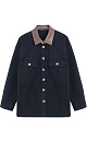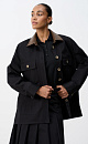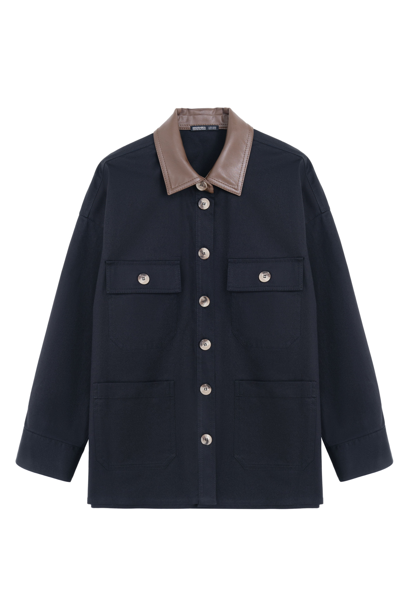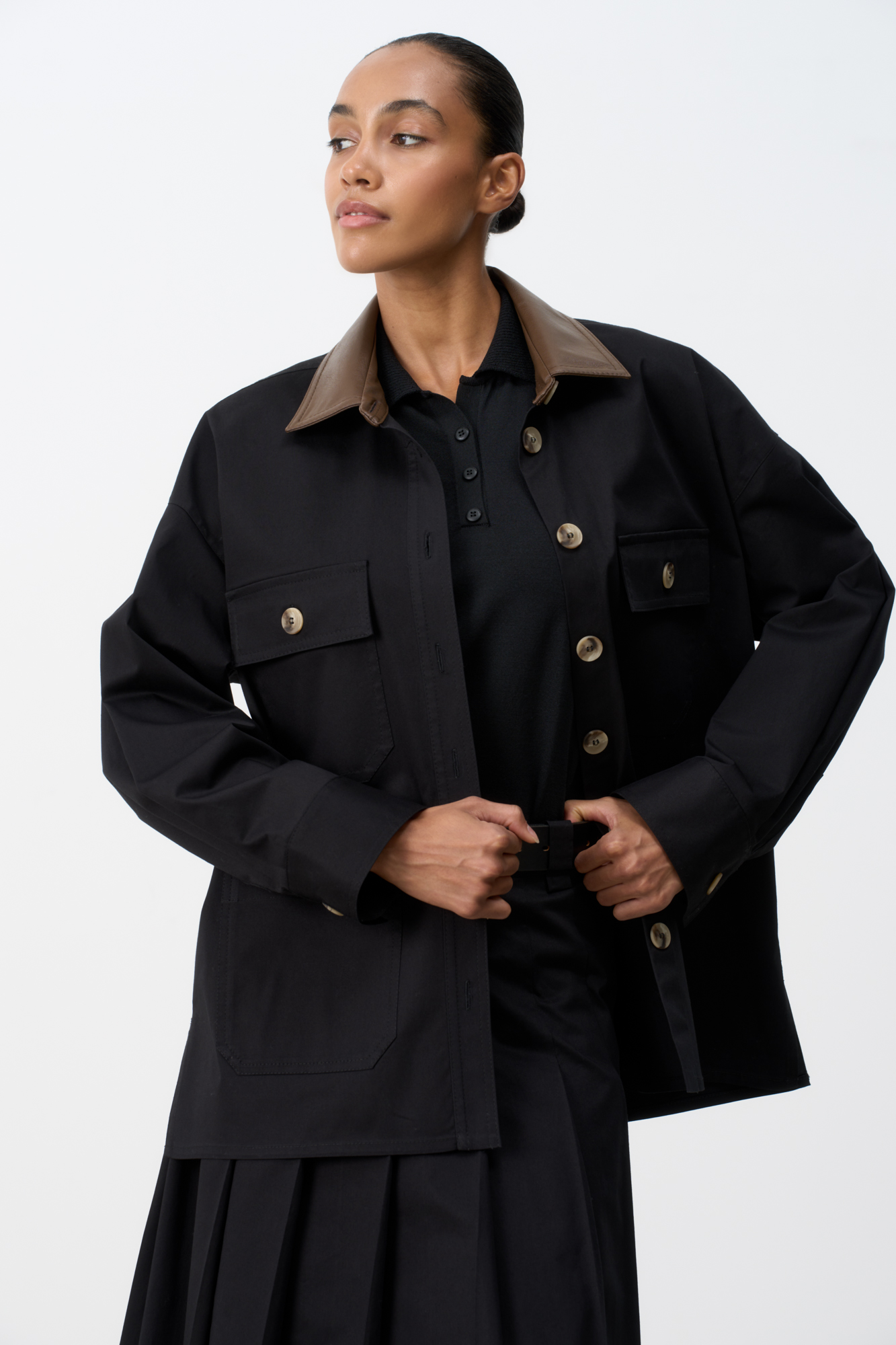 Jacket with patch pockets. The model has a loose silhouette, the collar is decorated with an eco-leather insert. Fabric with water-repellent Teflon coating. You can complement the look with a skirt in the same style.