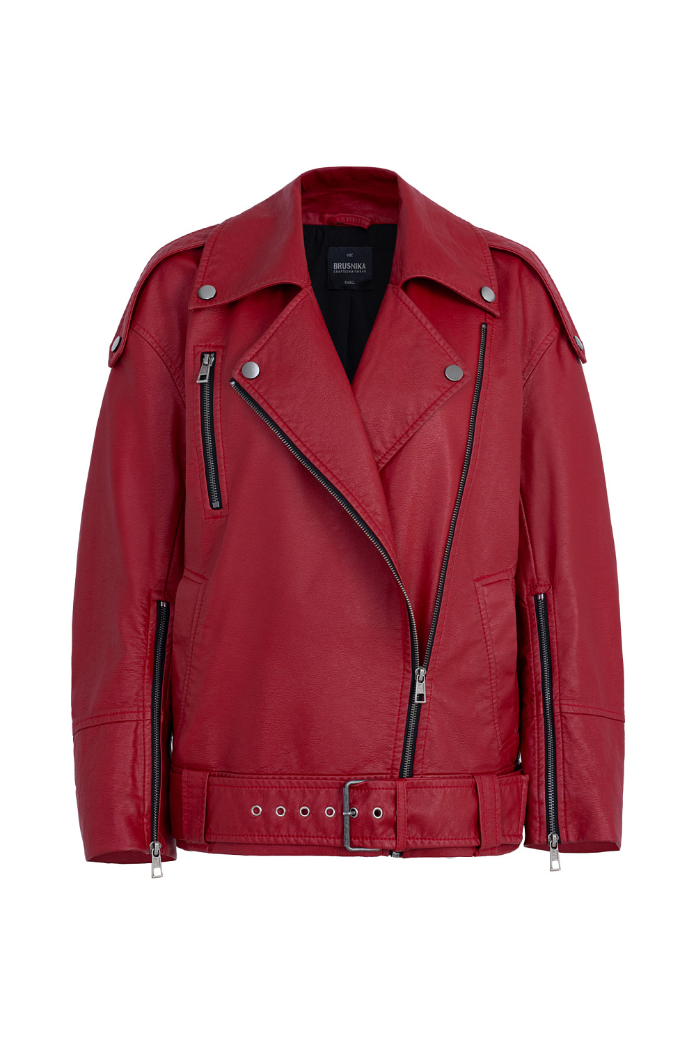 Eco-leather jacket with a belt. Loose silhouette model with dropped shoulders and side pockets. The product is decorated with metal buttons and zippers. Lined.