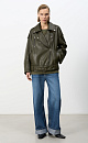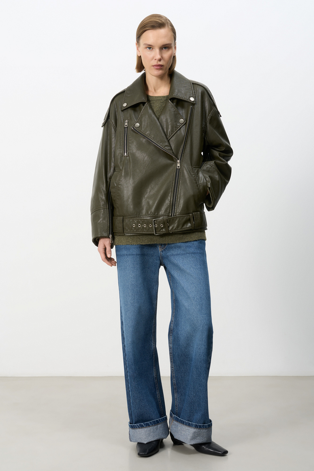 Eco-leather jacket with a belt. Loose silhouette model with dropped shoulders and side pockets. The product is decorated with metal buttons and zippers. Lined.