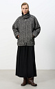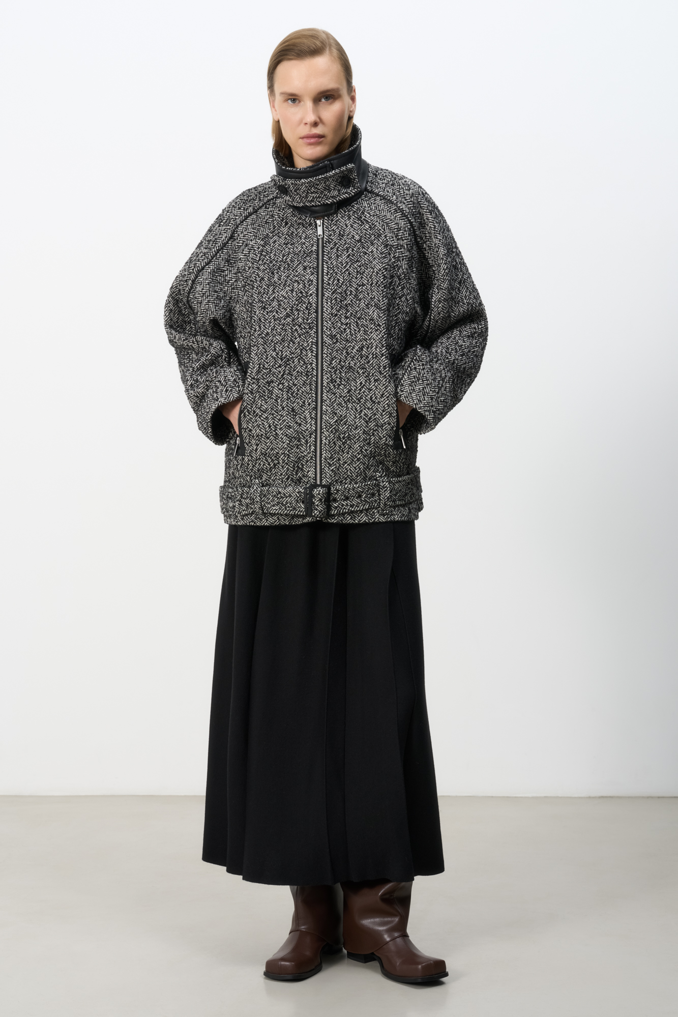 Wool blend jacket with belt. The model has a loose silhouette with dropped shoulders and a stand-up collar. Zip pockets. The product is decorated with eco-leather inserts. Zip closure. Lined.