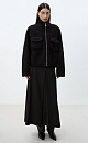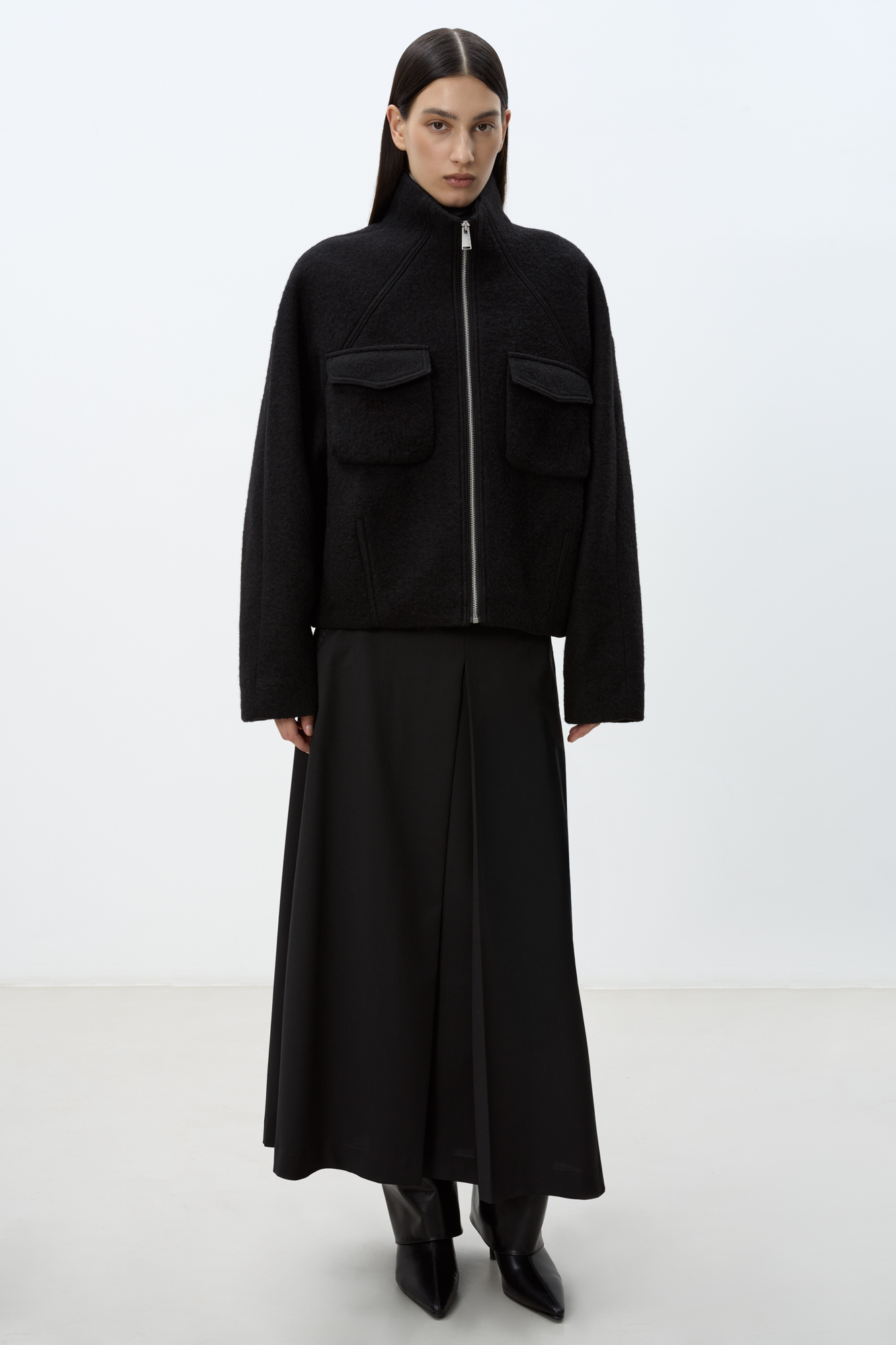 Wool jacket with raglan sleeves. The model has a loose silhouette with patch pockets on the chest and a one-piece stand-up collar. Zip closure. The product is lined.