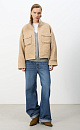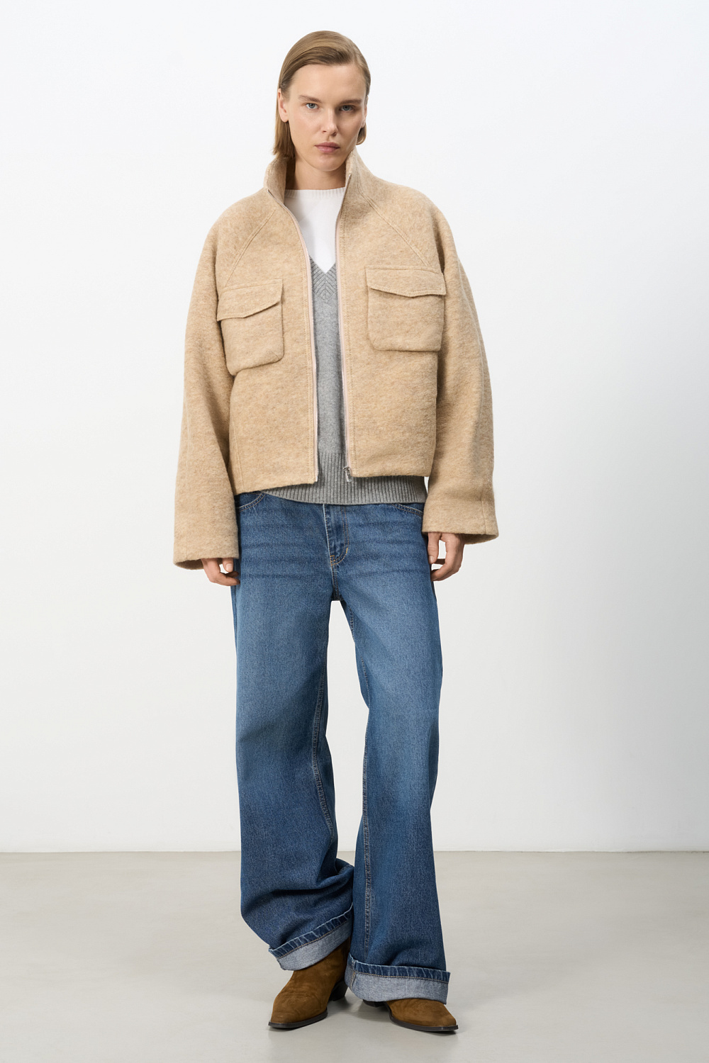 Wool jacket with raglan sleeves. The model has a loose silhouette with patch pockets on the chest and a one-piece stand-up collar. Zip closure. The product is lined.