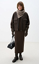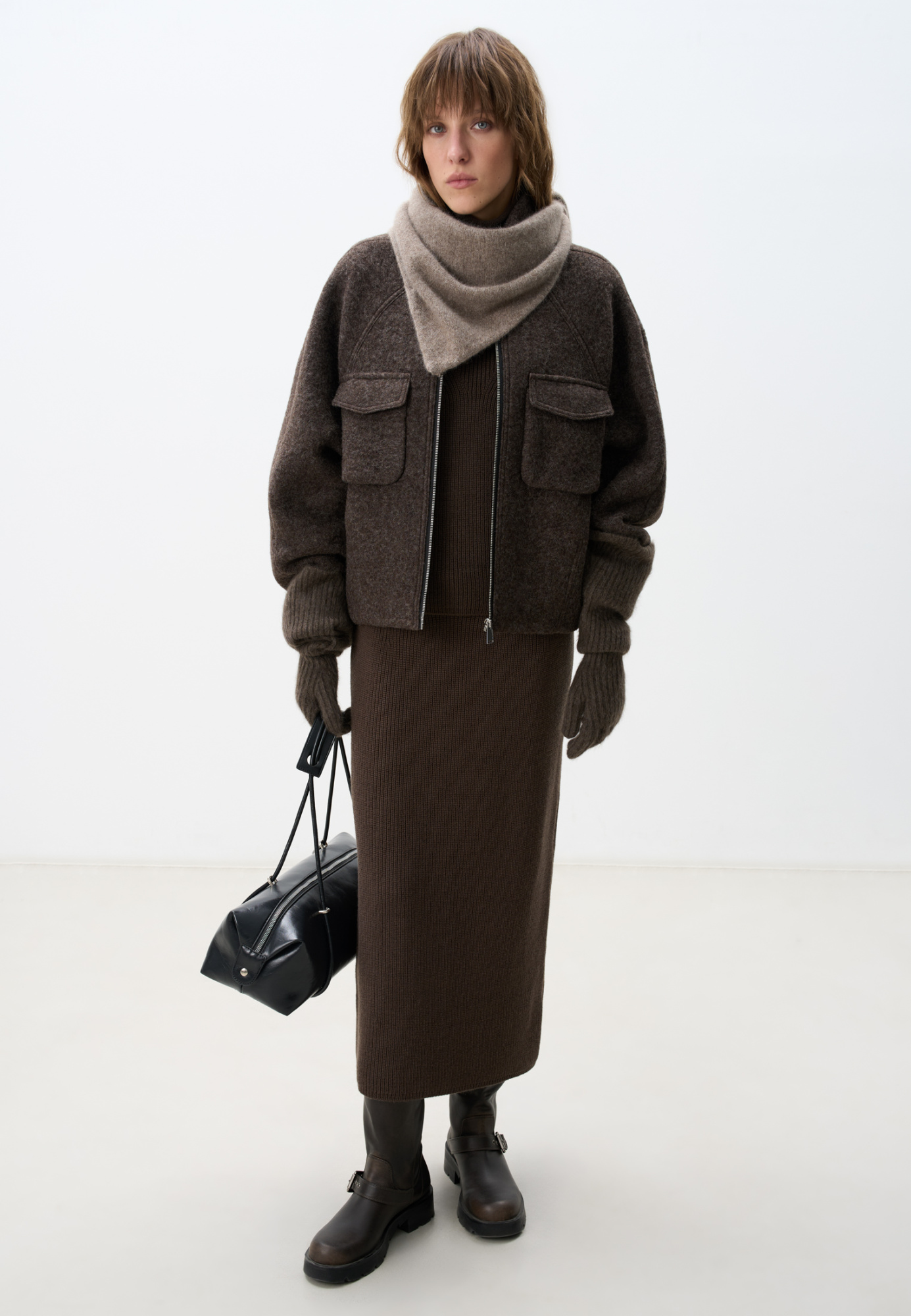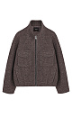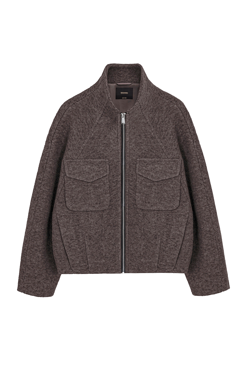 Wool jacket with raglan sleeves. The model has a loose silhouette with patch pockets on the chest and a one-piece stand-up collar. Zip closure. The product is lined.