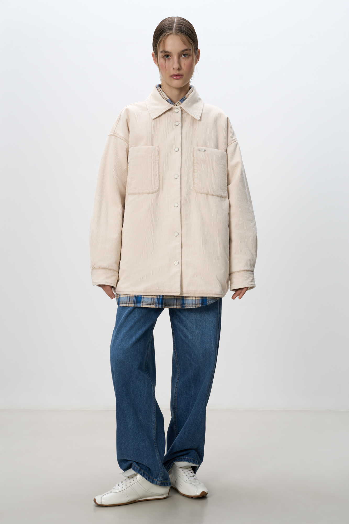 Corduroy jacket made of 100% cotton. Loose silhouette model with dropped shoulders, side and chest pockets. Buttoned cuffs. Magnetic button closure. The product is lined.
