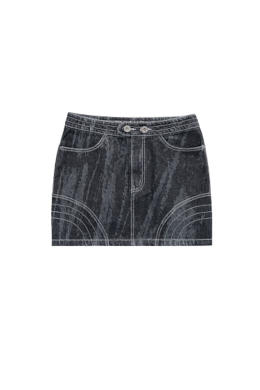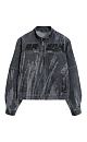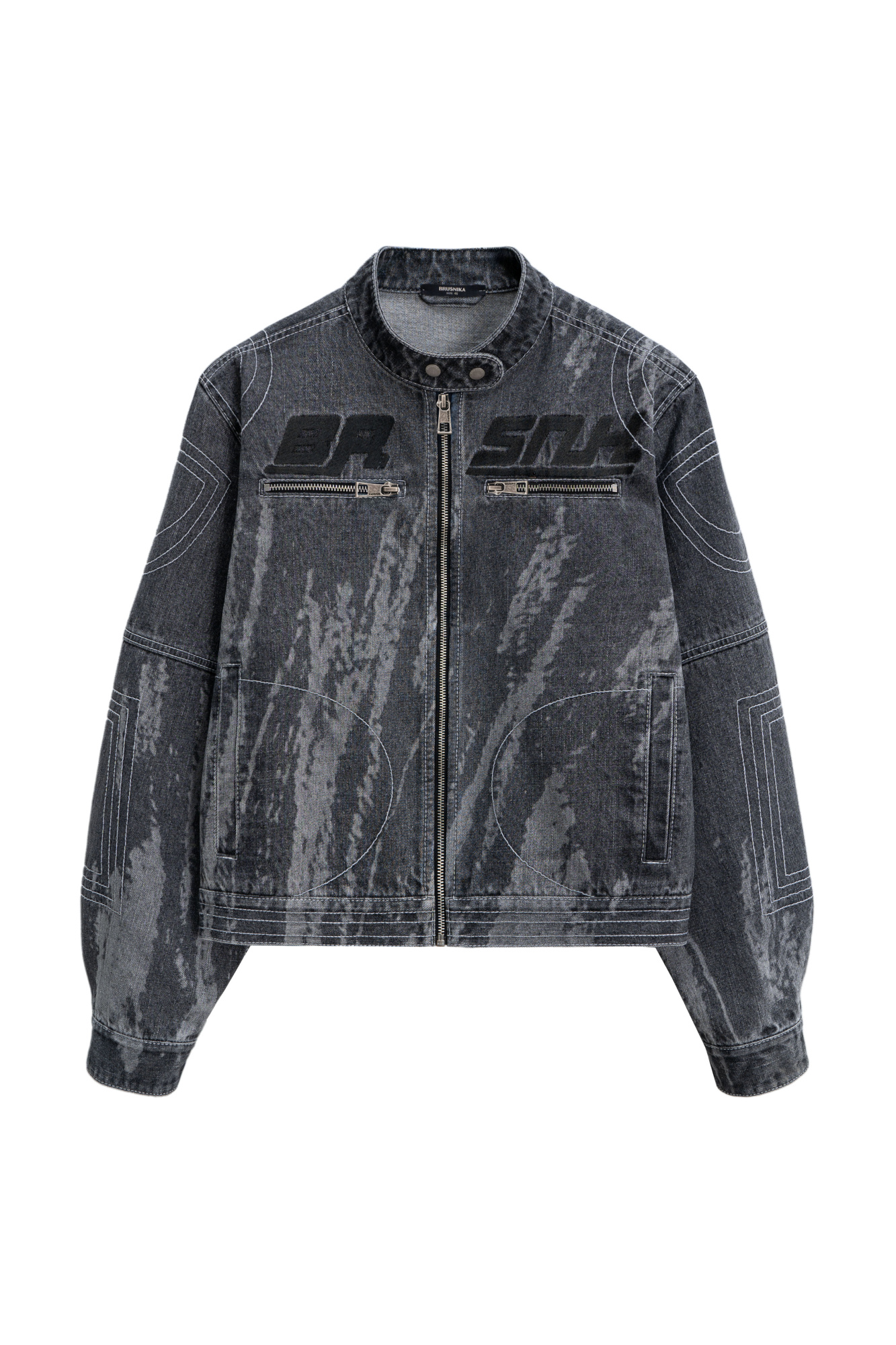 100% cotton denim jacket. Loose silhouette model with a short stand-up collar. The product is decorated with contrasting color stitching that forms graphic accents on the shoulders and sleeves, branded embroidery on the chest, side pockets and pockets on the chest under a zipper. Zip closure. No lining.