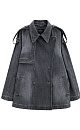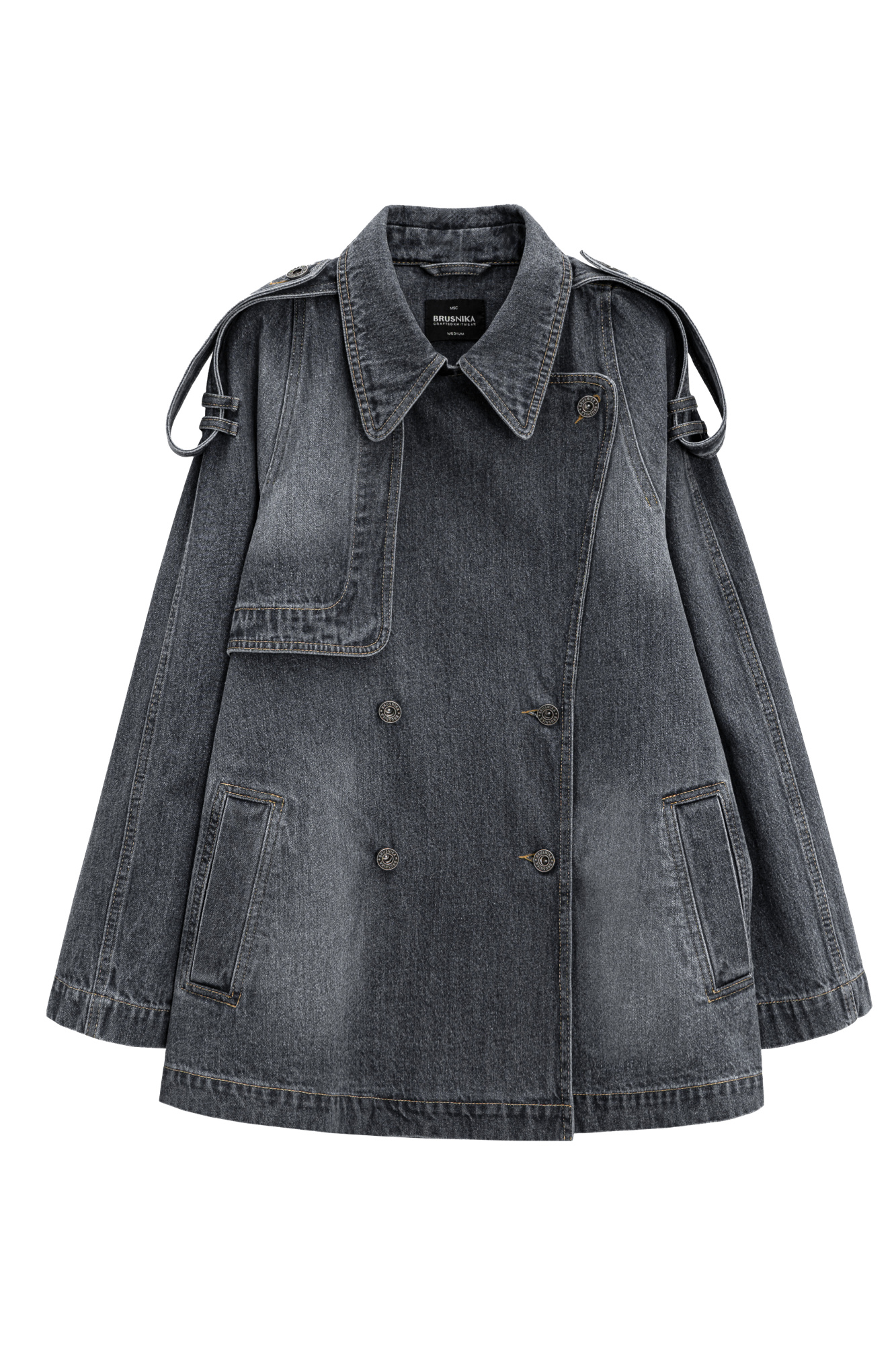 Denim double-breasted trench coat made of 100% cotton. The model has a loose fit, with a classic turn-down collar, a flyaway yoke, shoulder patches, two side pockets and belt loops at the waist. Fastening with metal buttons. The product is unlined.