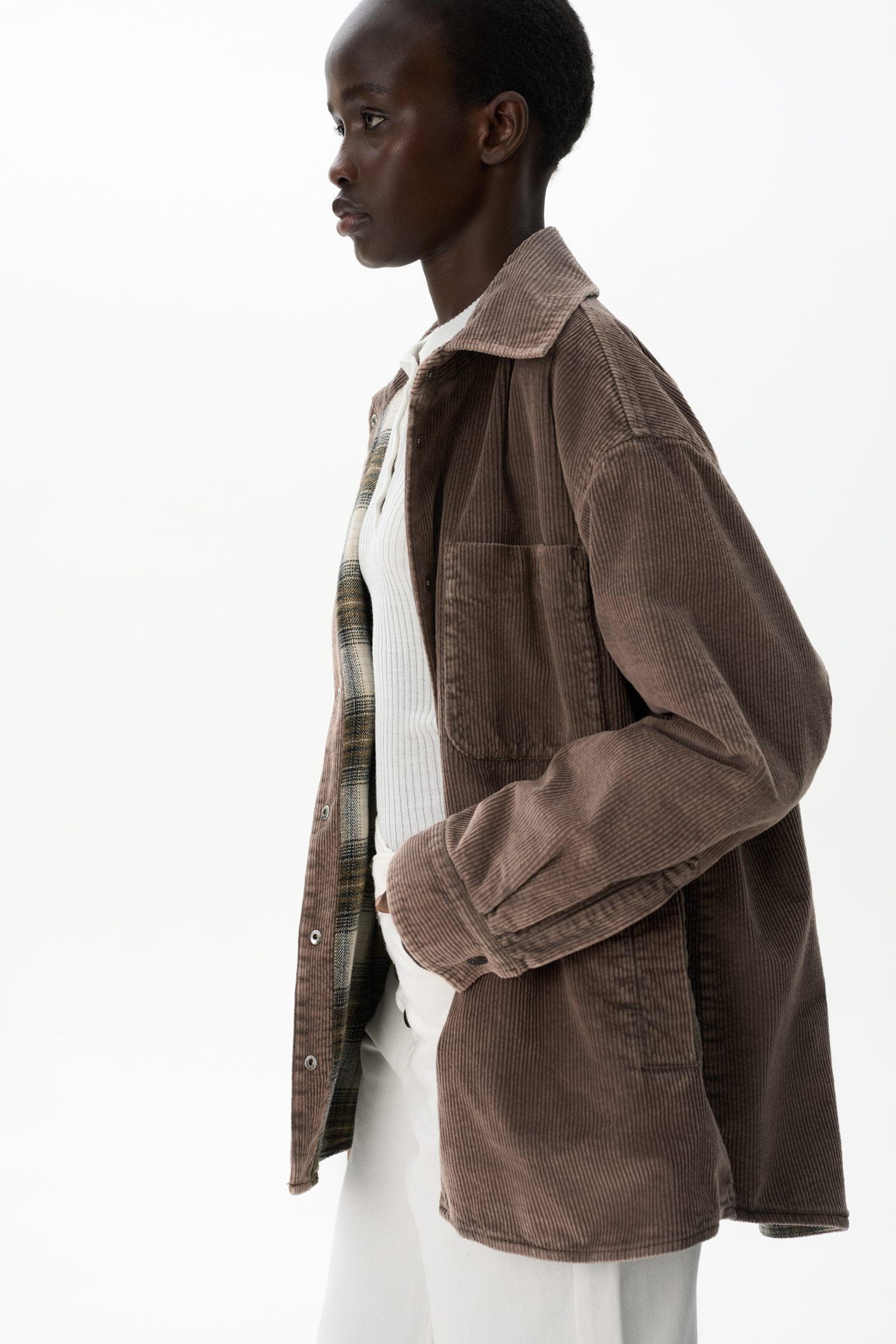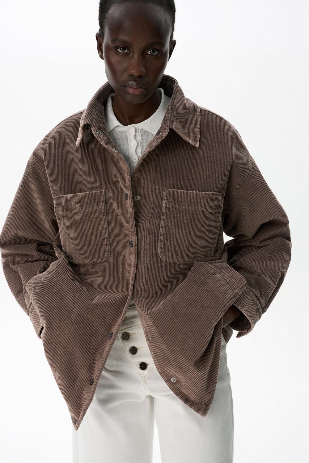 Cotton corduroy jacket. Straight-fit model with a turn-down collar, two patch pockets on the chest, two welt pockets and a button closure. The product is lined.