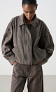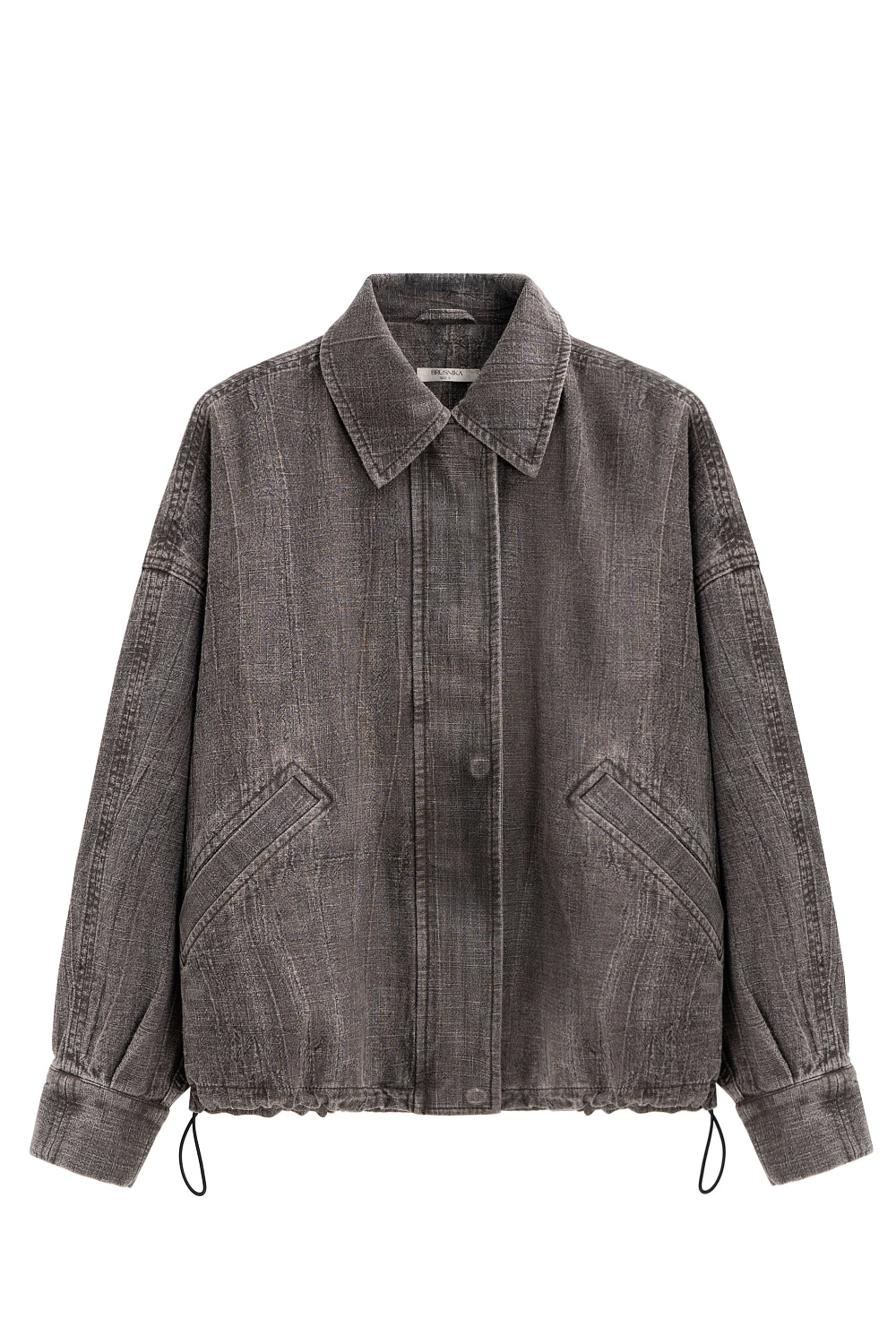 Jacket made of thick linen. The model has a loose fit, with a classic turn-down collar, zipper closure and buttons under the placket. The bottom of the product is made with an adjustable drawstring.