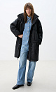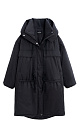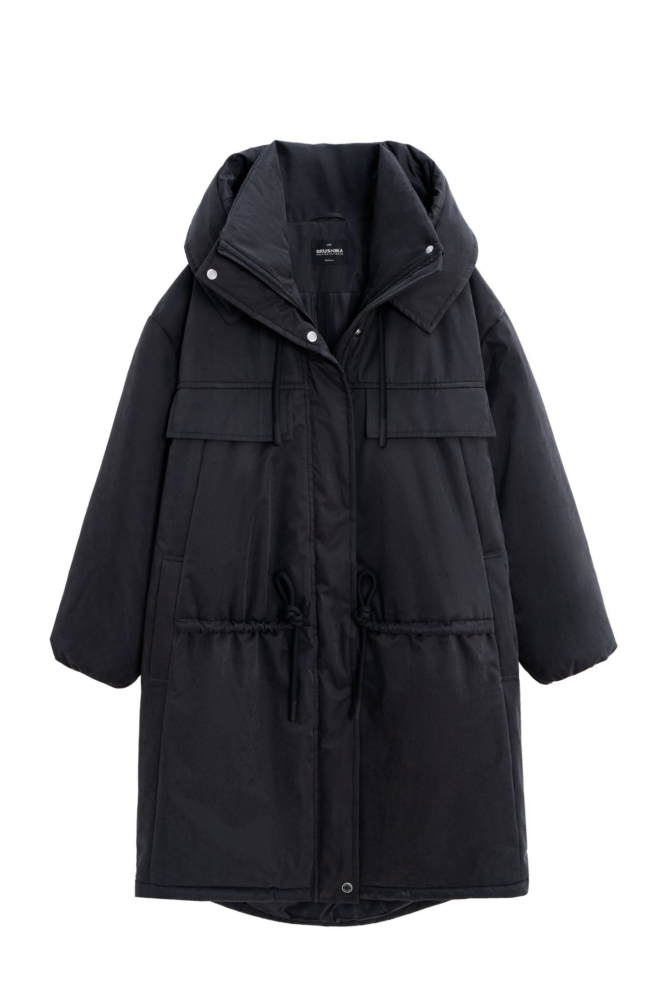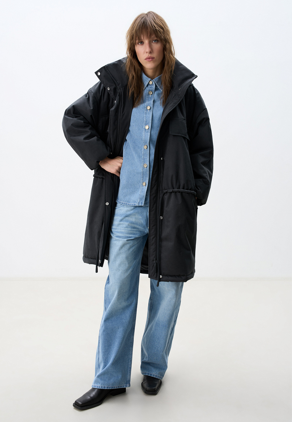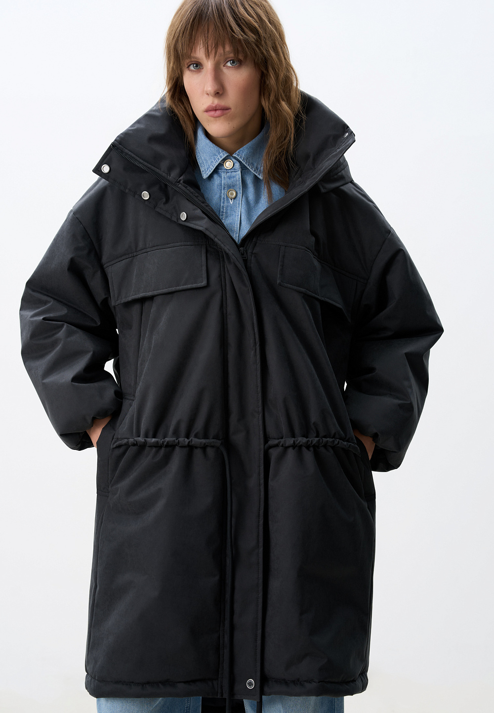 Long jacket on synthetic padding with a hood. The model has a loose silhouette with dropped shoulders, patch and side pockets, and an adjustable drawstring at the waist. The product is lined. Zip closure and magnetic snaps.
