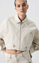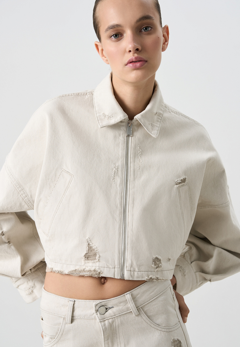 100% cotton denim jacket. A cropped silhouette with a turn-down collar, long sleeves, slits and a distressed effect. Zip closure. You can complement the look with jeans in the same style.