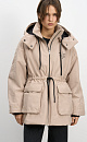 Parka with sintepon. A loose-fitting model with an adjustable drawstring at the waist, large patch pockets with flaps, a dropped shoulder line, and a stand collar. The jacket comes with an additional voluminous collar and hood. It is fastened with a zipper. The product is lined.