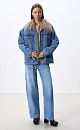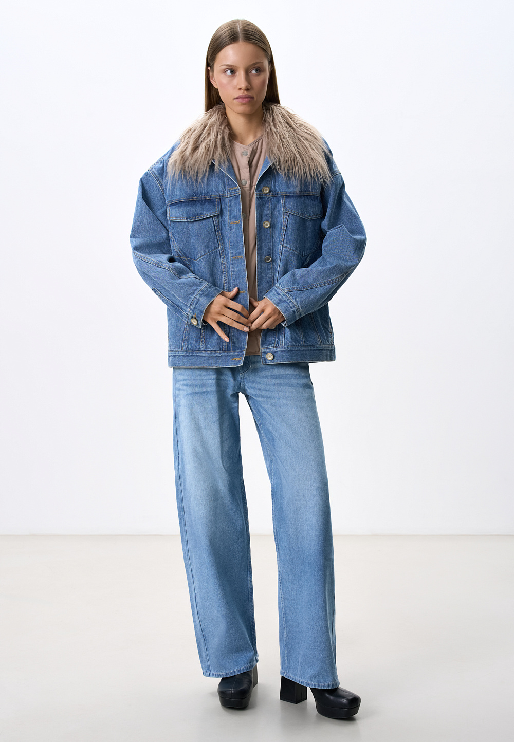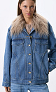 Denim jacket with removable fur collar. Turn-down collar. Long sleeves with snap cuffs. Chest pockets with flaps. Metal button closure. Comes with a magnetic snap down vest with sintepon, which will allow you to wear the jacket in colder weather.