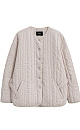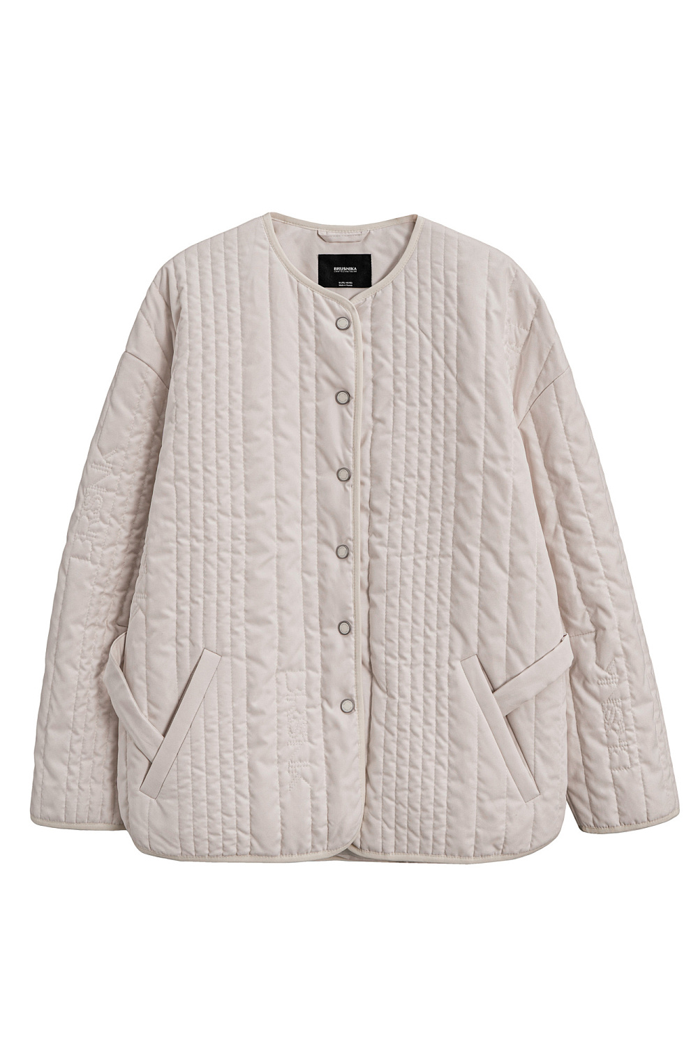 A quilted jacket with a nylon lining. It features a round neckline, a dropped shoulder line, and pockets. It is button-up.