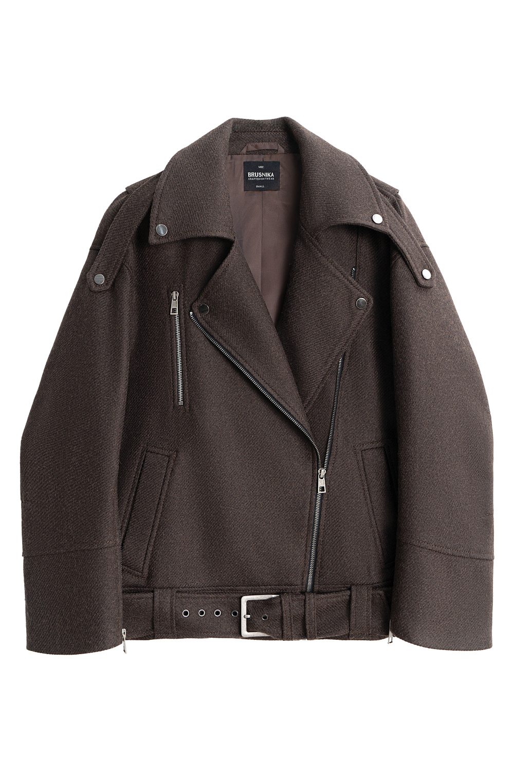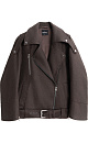 Jacket-leather jacket made of wool. The model has a loose silhouette with a lowered shoulder line and an oblique closure. The product is decorated with shoulder epaulettes, a wide belt with a buckle at the waist, side and chest pockets. The product is lined.