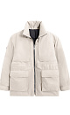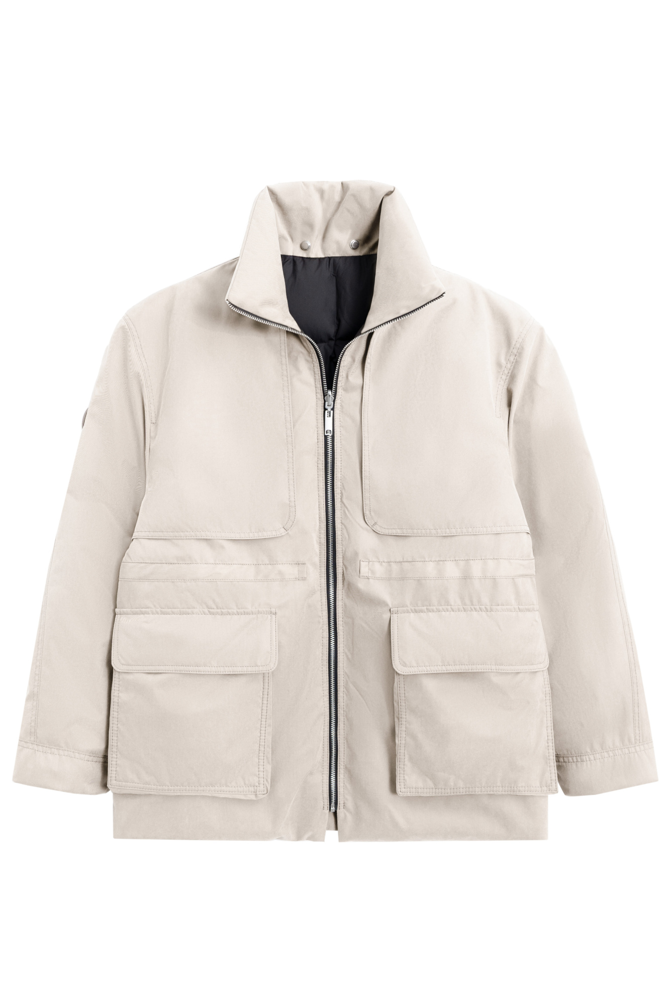 Reversible down jacket. Loose silhouette model with an adjustable drawstring at the waist, large patch pockets with flaps and a stand-up collar. The jacket comes with an additional voluminous collar and hood. Zip closure.