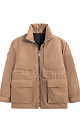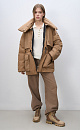 Reversible down jacket. Loose silhouette model with an adjustable drawstring at the waist, large patch pockets with flaps and a stand-up collar. The jacket comes with an additional voluminous collar and hood. Zip closure.