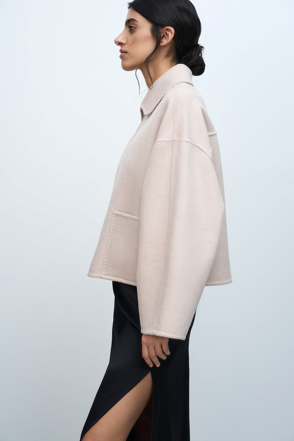 Straight fit short jacket with zip fastening and patch pockets. Accent seams with hand-stitch imitation. The jacket is made using double face technology, so the inside looks as neat as the outside.