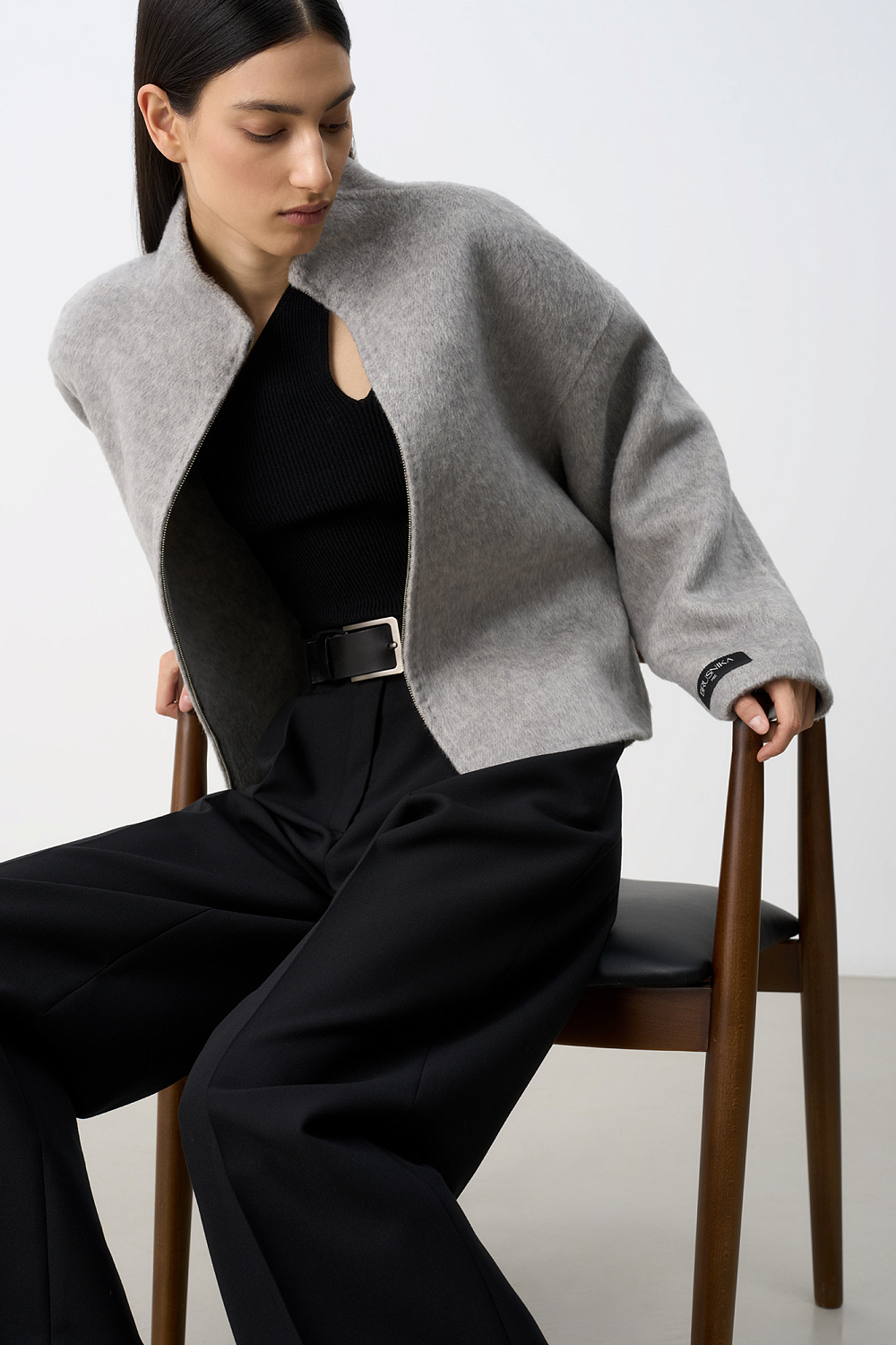 Short jacket with dropped shoulders. Loose silhouette with side pockets and logo on the sleeve.