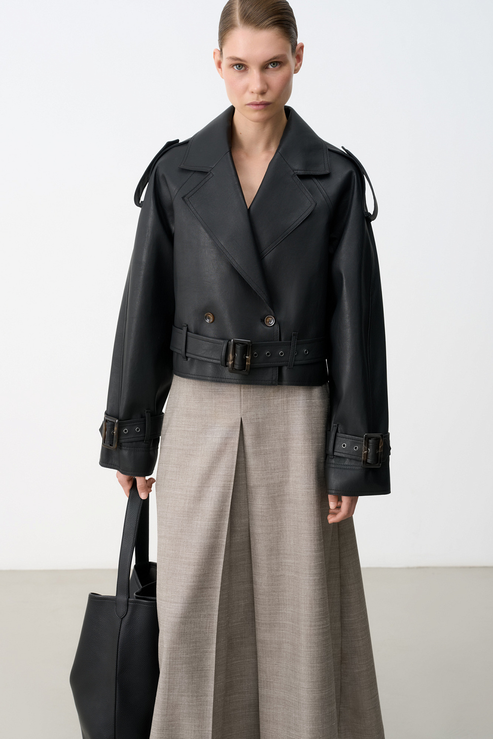 Double-breasted leather jacket made of double-sided eco-leather. The model features a loose silhouette with dropped shoulders and wide lapels. The product is decorated with patties on the shoulders and belts with large buckles on the waist and sleeves.