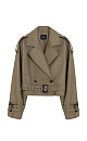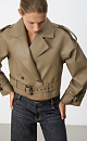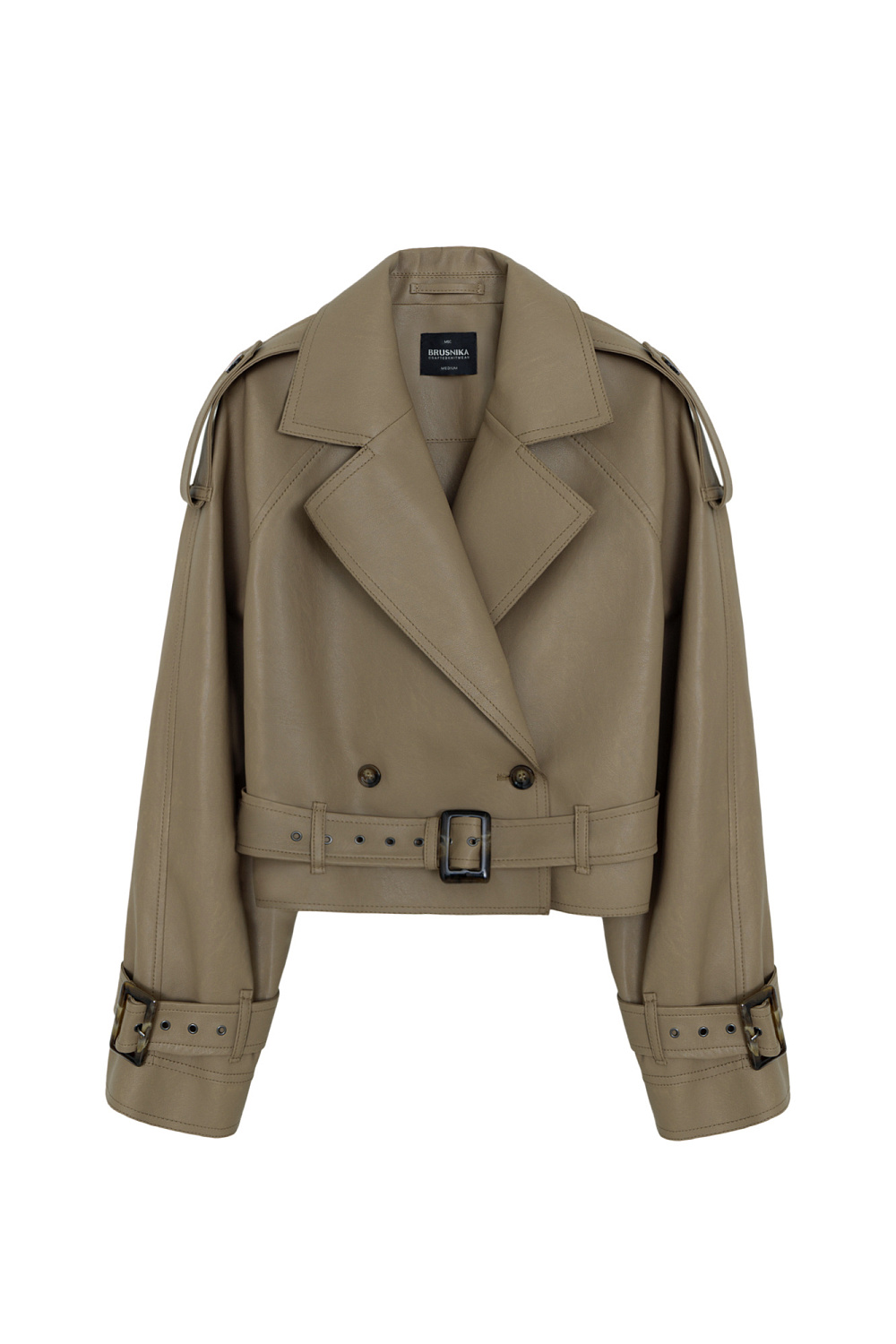 Double-breasted leather jacket made of double-sided eco-leather. The model features a loose silhouette with dropped shoulders and wide lapels. The product is decorated with patties on the shoulders and belts with large buckles on the waist and sleeves.