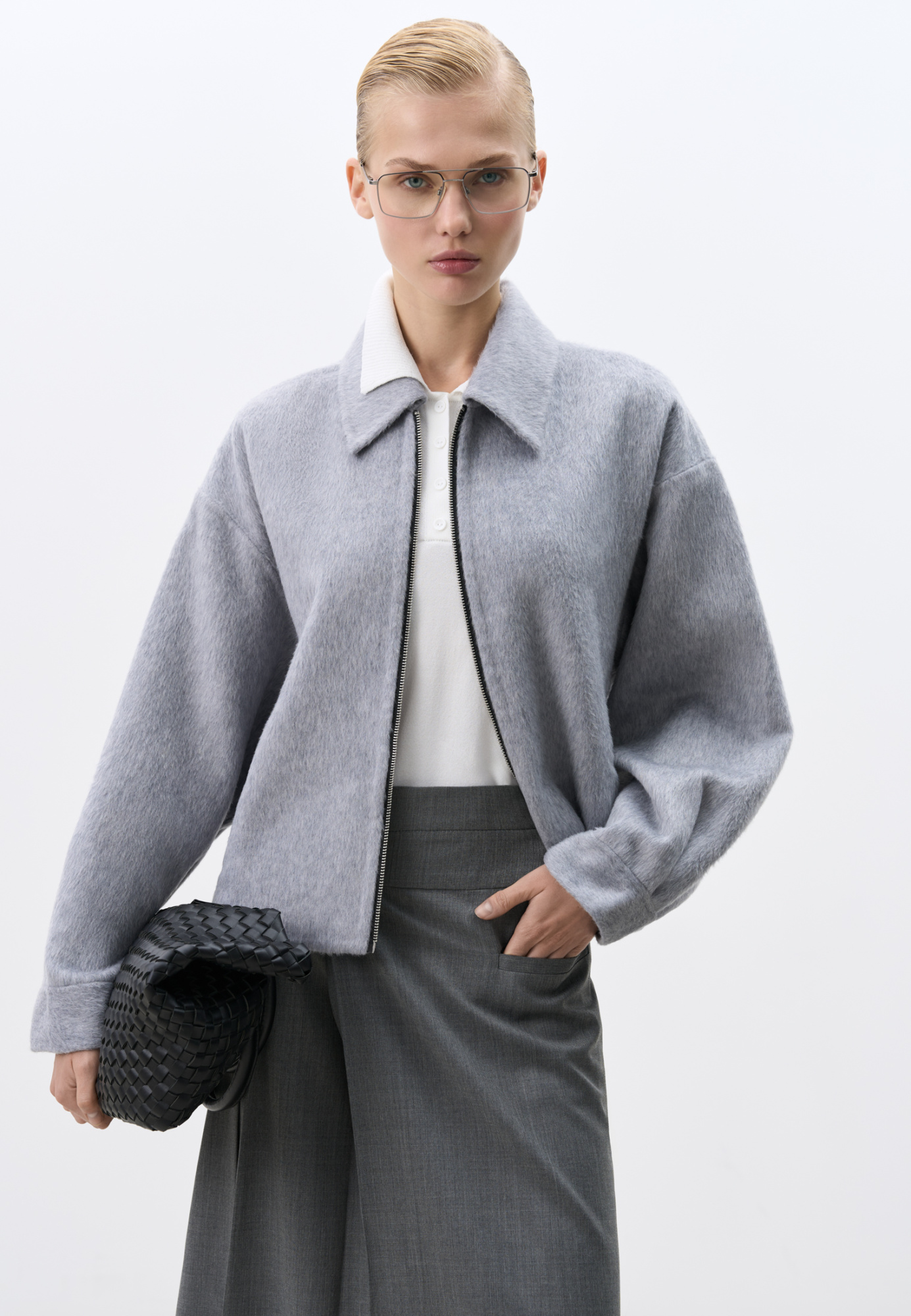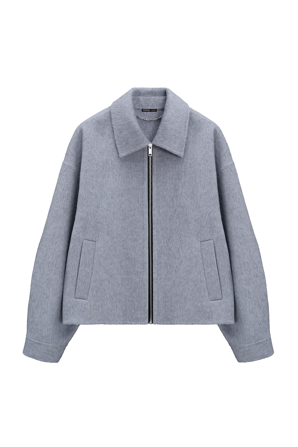 Jacket with zipper made of 100% wool. A loose fit model with a turn-down collar, dropped shoulders and two side pockets. Zip closure. Branded label on the back.