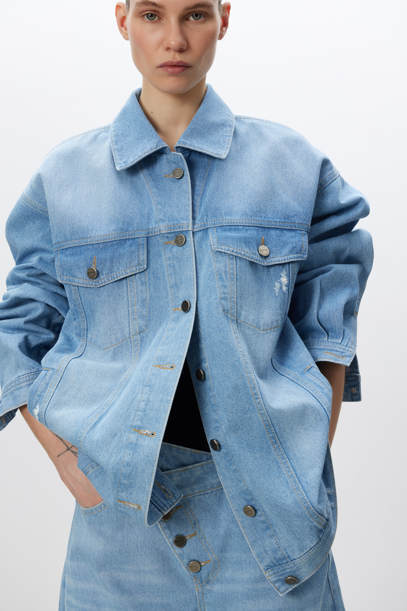 Oversized straight-fit denim jacket. Turn-down collar, long sleeves with buttoned cuffs. Patch pockets on the chest and side pockets on the front. Button fastening.