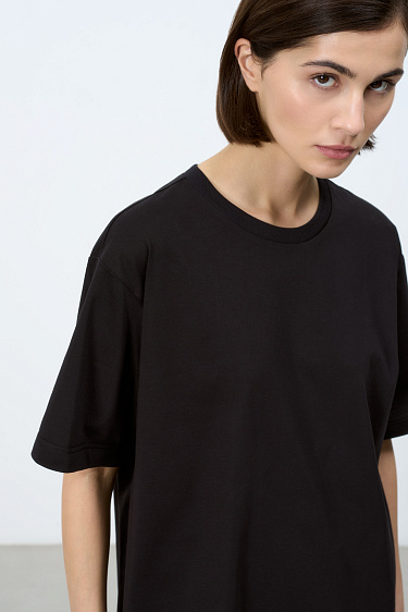 Biker jacket made of raincoat fabric. Double-breasted model with dropped shoulders and a classic English collar. The product is decorated with epaulettes on the shoulders, a wide belt with a buckle at the waist and sleeve cuffs and an imitation raw edge. Lined.