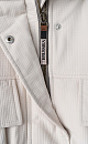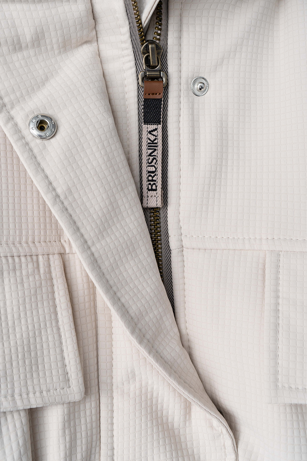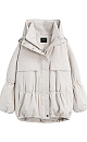 Long jacket with padding polyester made of textured fabric. The model has a loose silhouette with dropped shoulders, patch and side pockets, a stand-up collar and a hood. The product is lined. Zip fastening under the placket with buttons.