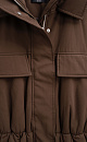 Long jacket with padding polyester made of textured fabric. The model has a loose silhouette with dropped shoulders, patch and side pockets, a stand-up collar and a hood. The product is lined. Zip fastening under the placket with buttons.