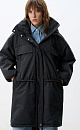 Long jacket on synthetic padding with a hood. The model has a loose silhouette with dropped shoulders, patch and side pockets, and an adjustable drawstring at the waist. The product is lined. Zip closure and magnetic snaps.