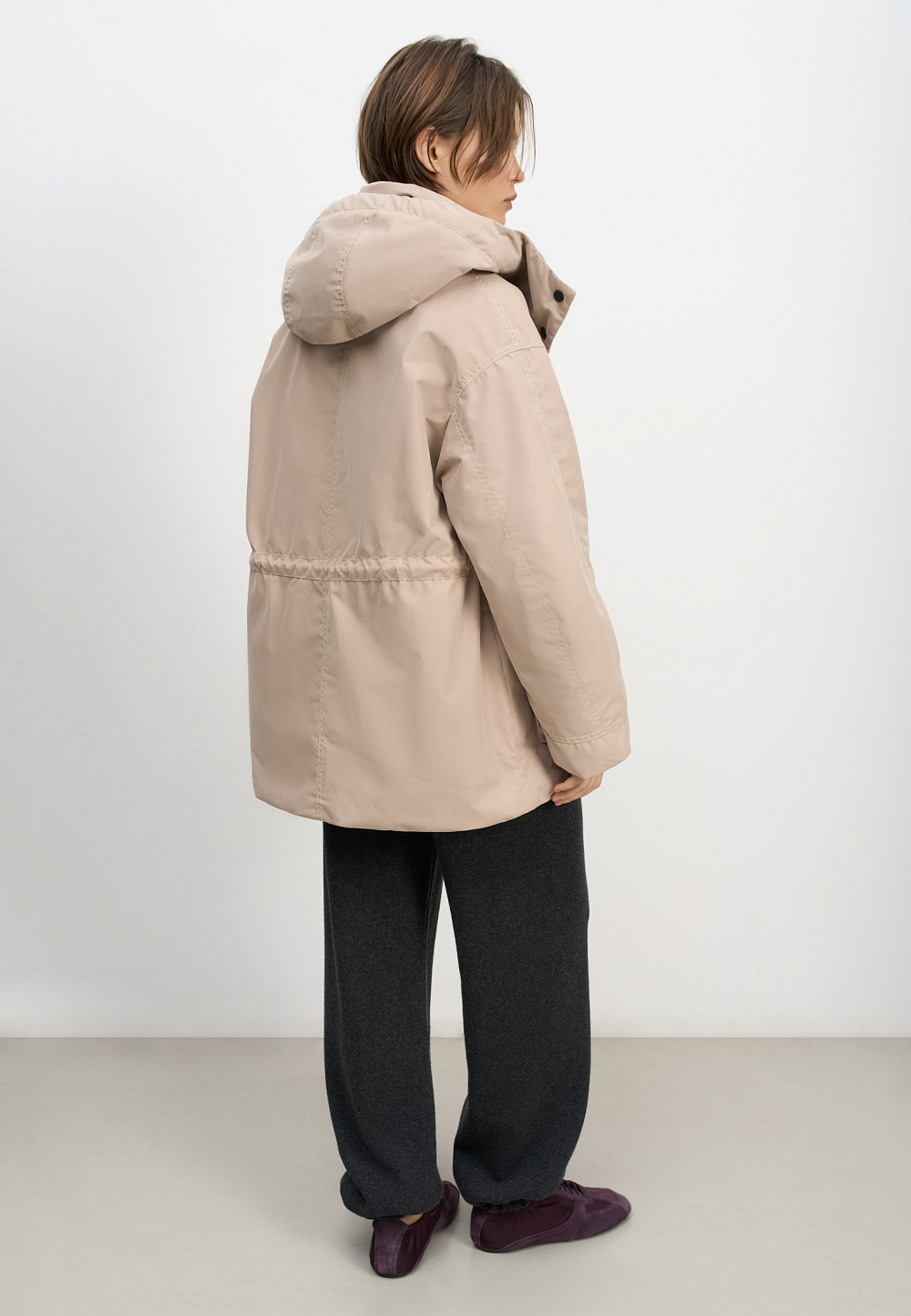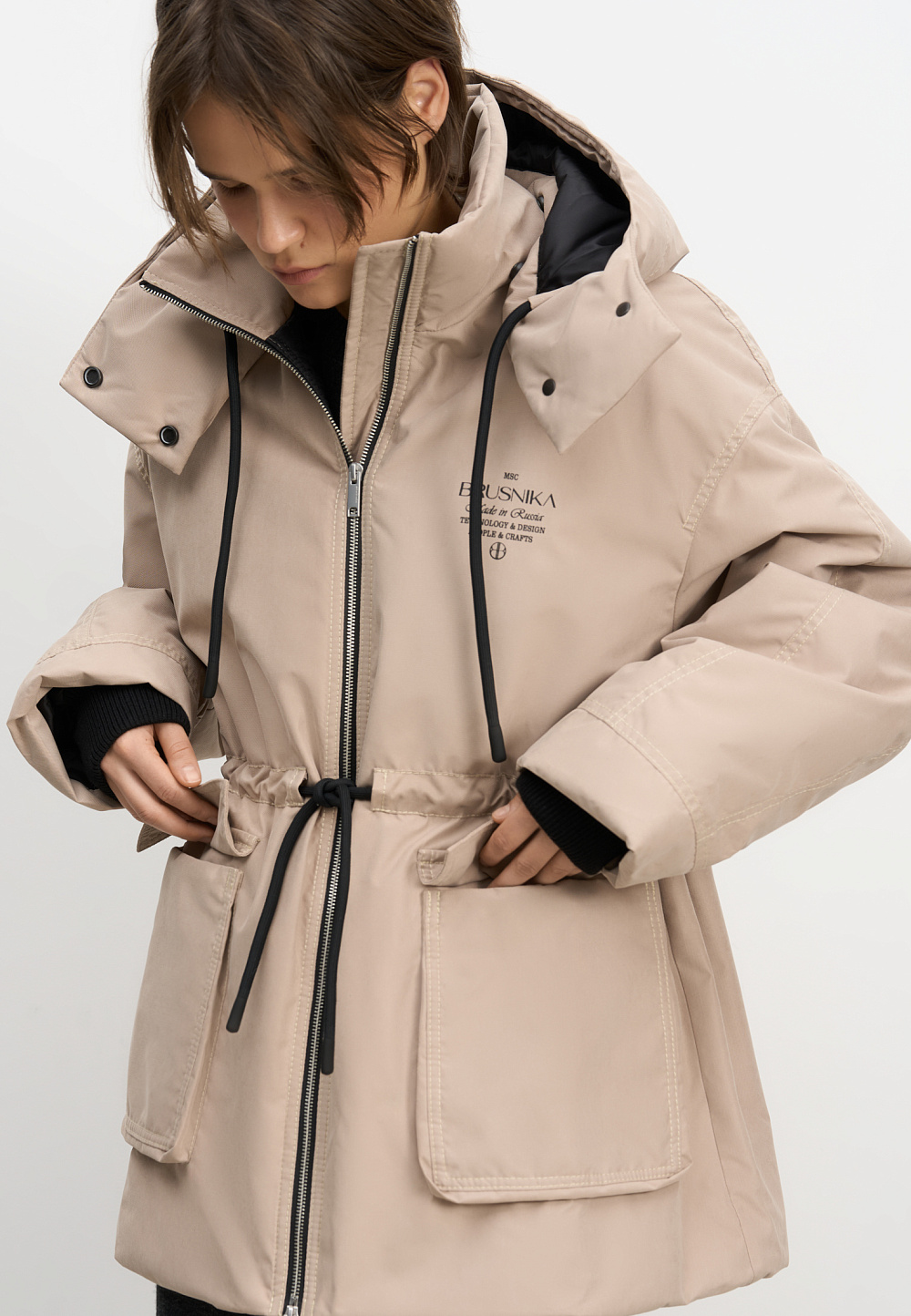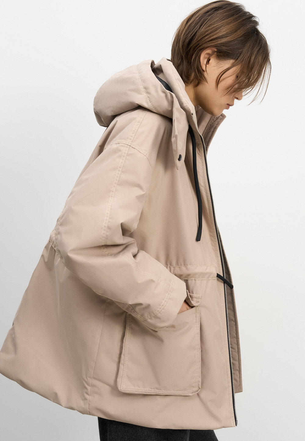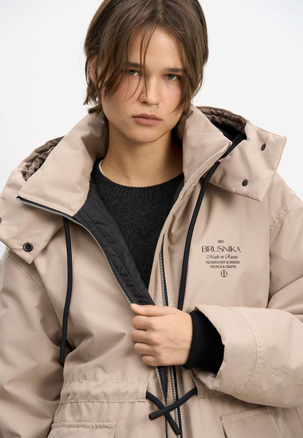 Parka with sintepon. A loose-fitting model with an adjustable drawstring at the waist, large patch pockets with flaps, a dropped shoulder line, and a stand collar. The jacket comes with an additional voluminous collar and hood. It is fastened with a zipper. The product is lined.