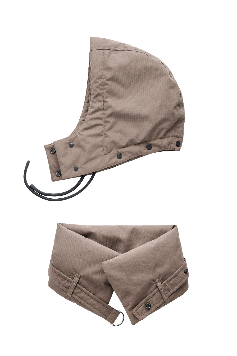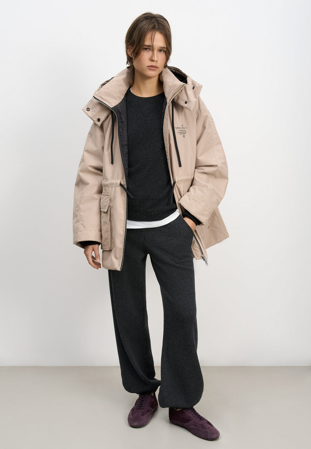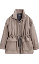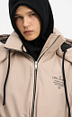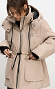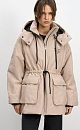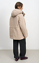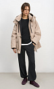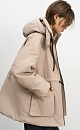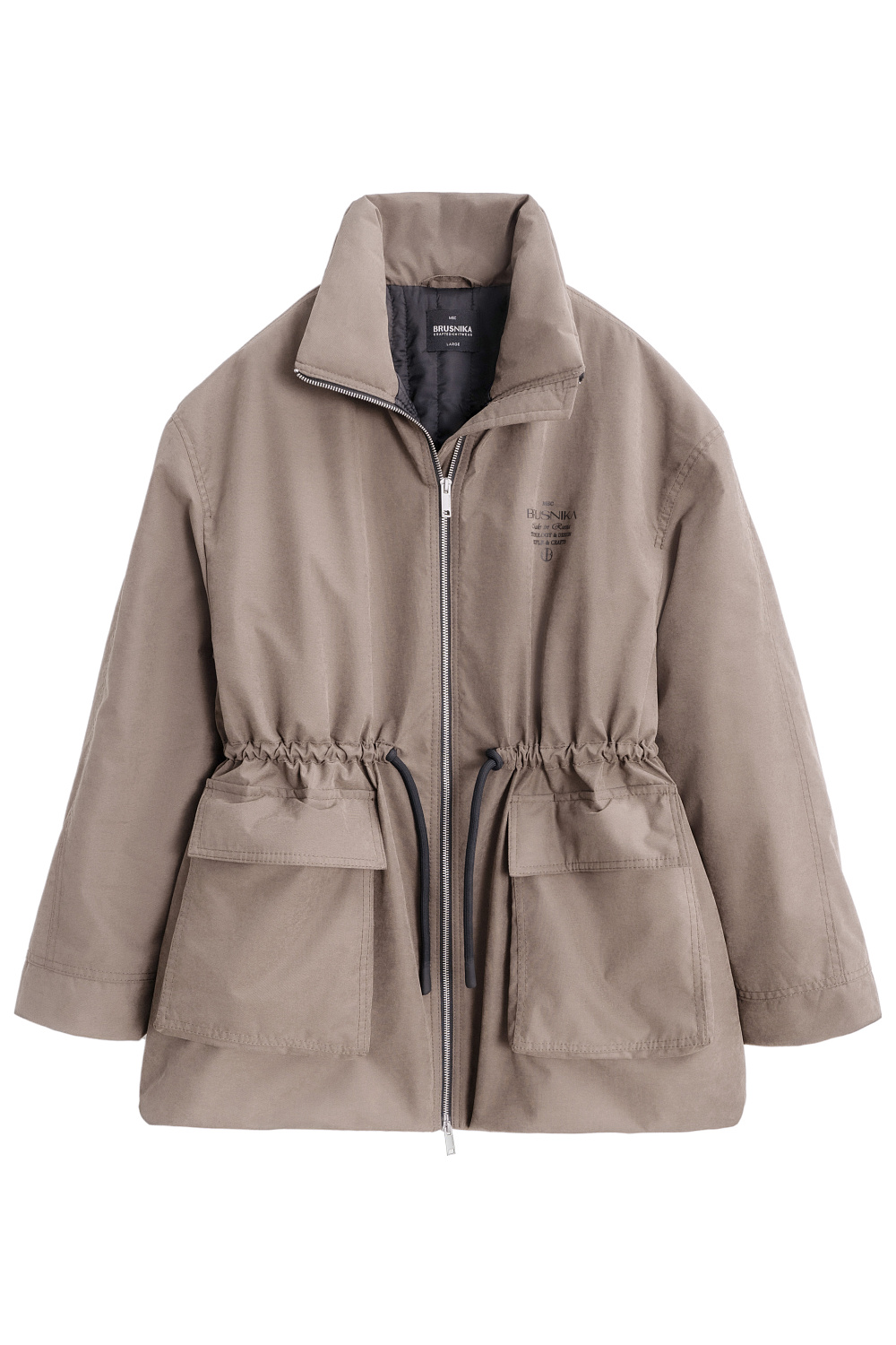 Parka with sintepon. A loose-fitting model with an adjustable drawstring at the waist, large patch pockets with flaps, a dropped shoulder line, and a stand collar. The jacket comes with an additional voluminous collar and hood. It is fastened with a zipper. The product is lined.