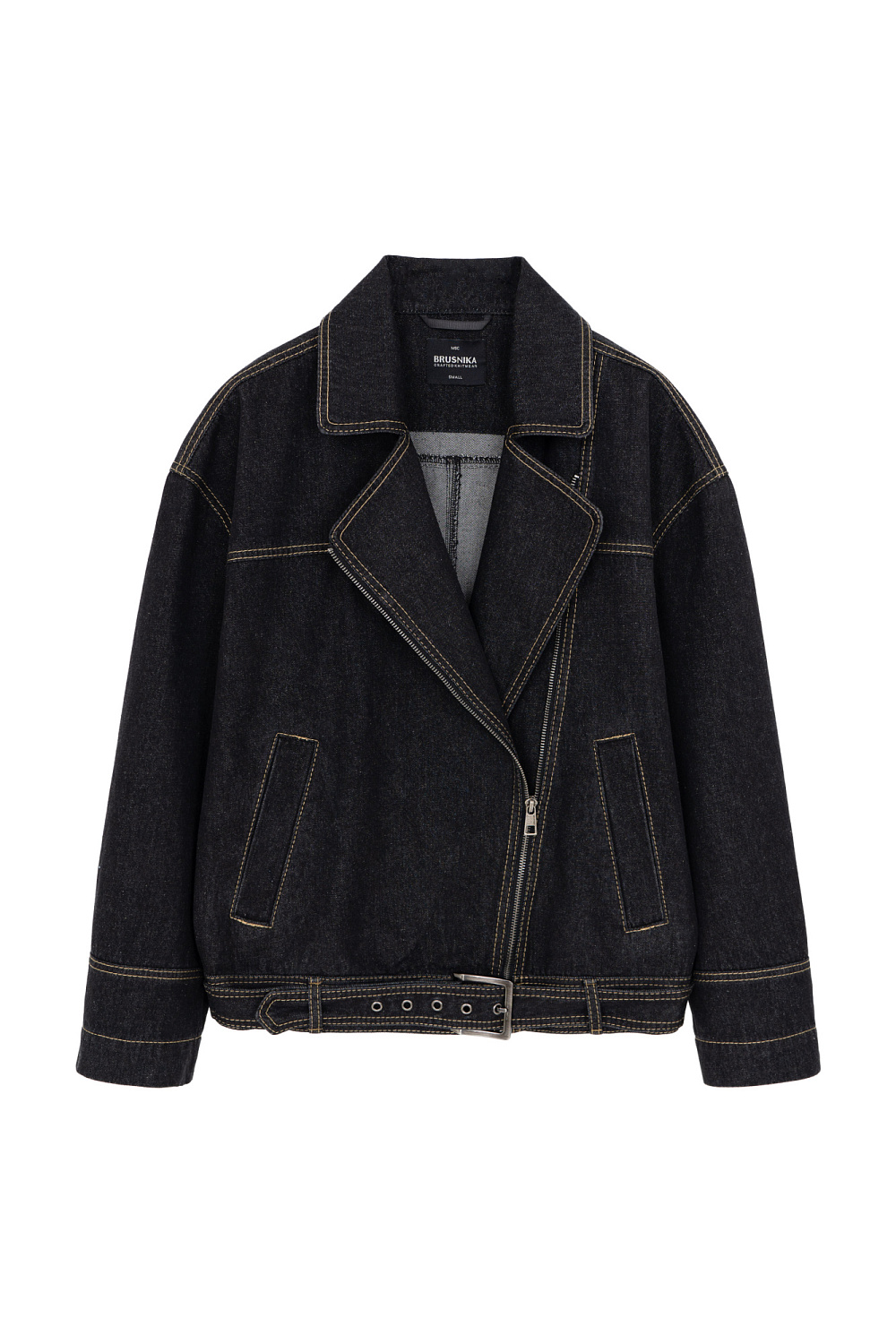 Oversized unlined denim jacket with a turn-down collar, side pockets and a wide belt with a buckle. Long sleeves are decorated with lacing. Asymmetrical zip fastening.