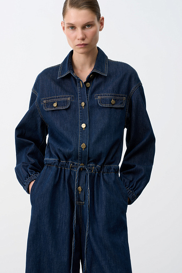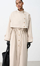 Single-breasted trench coat with asymmetrical yoke. The model is loose-fitting, with a stand-up collar, studded cuffs and side pockets. Accentuate the waist with an adjustable drawstring. The product is unlined. Button closure.