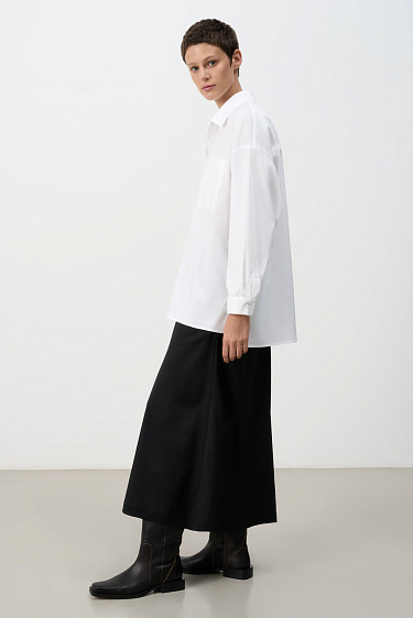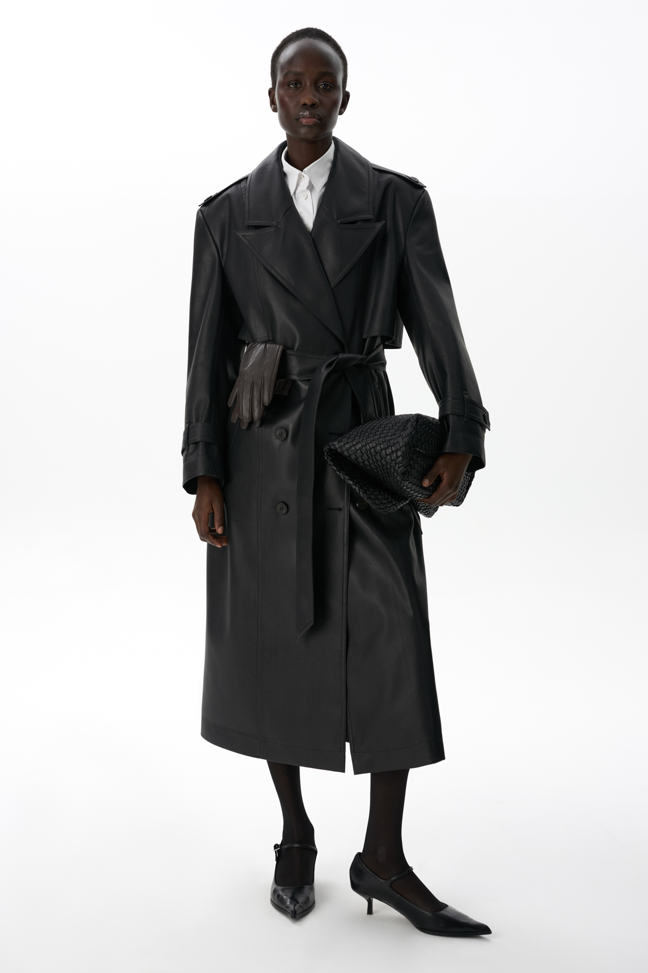 Double-breasted eco-leather trench coat. Straight silhouette model with a classic English collar and yoke. The sleeves are decorated with straps at the cuffs and large buttons. Two pockets. Belt loops at the waist.