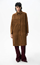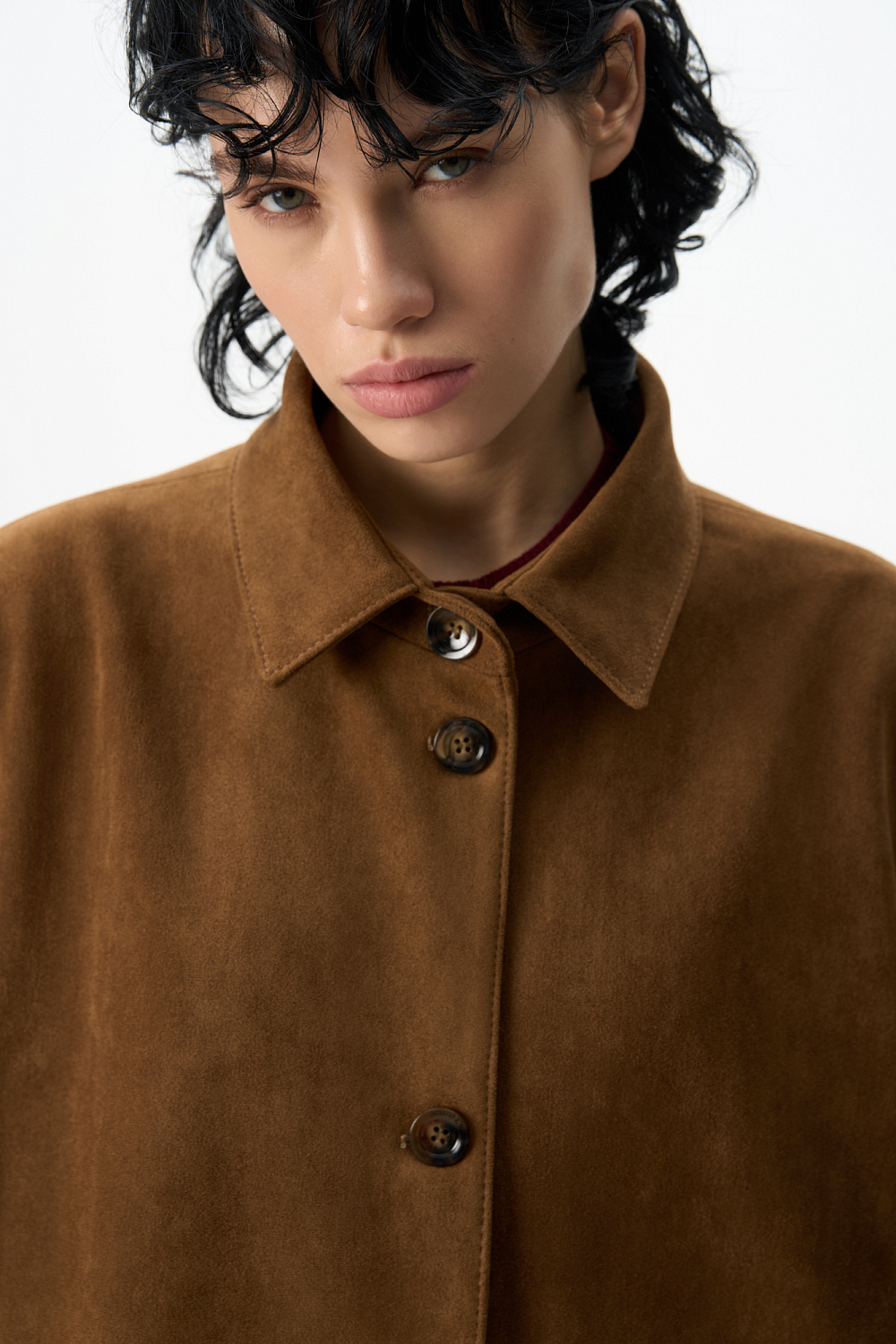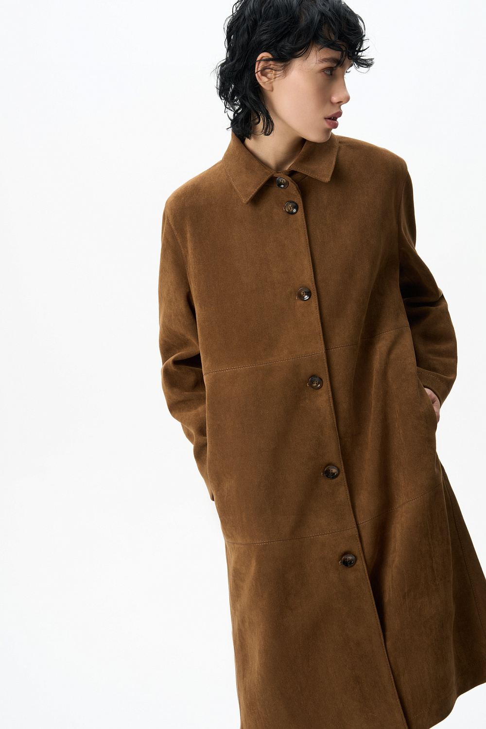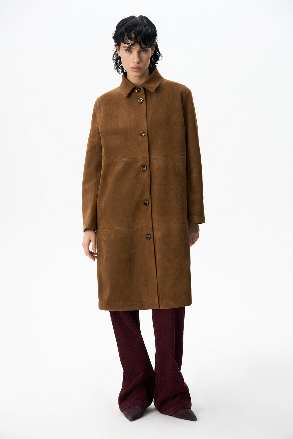 Trench coat made of fabric with an imitation of the appearance and properties of natural suede. Straight cut model with turn-down collar. Fastening with large buttons.