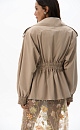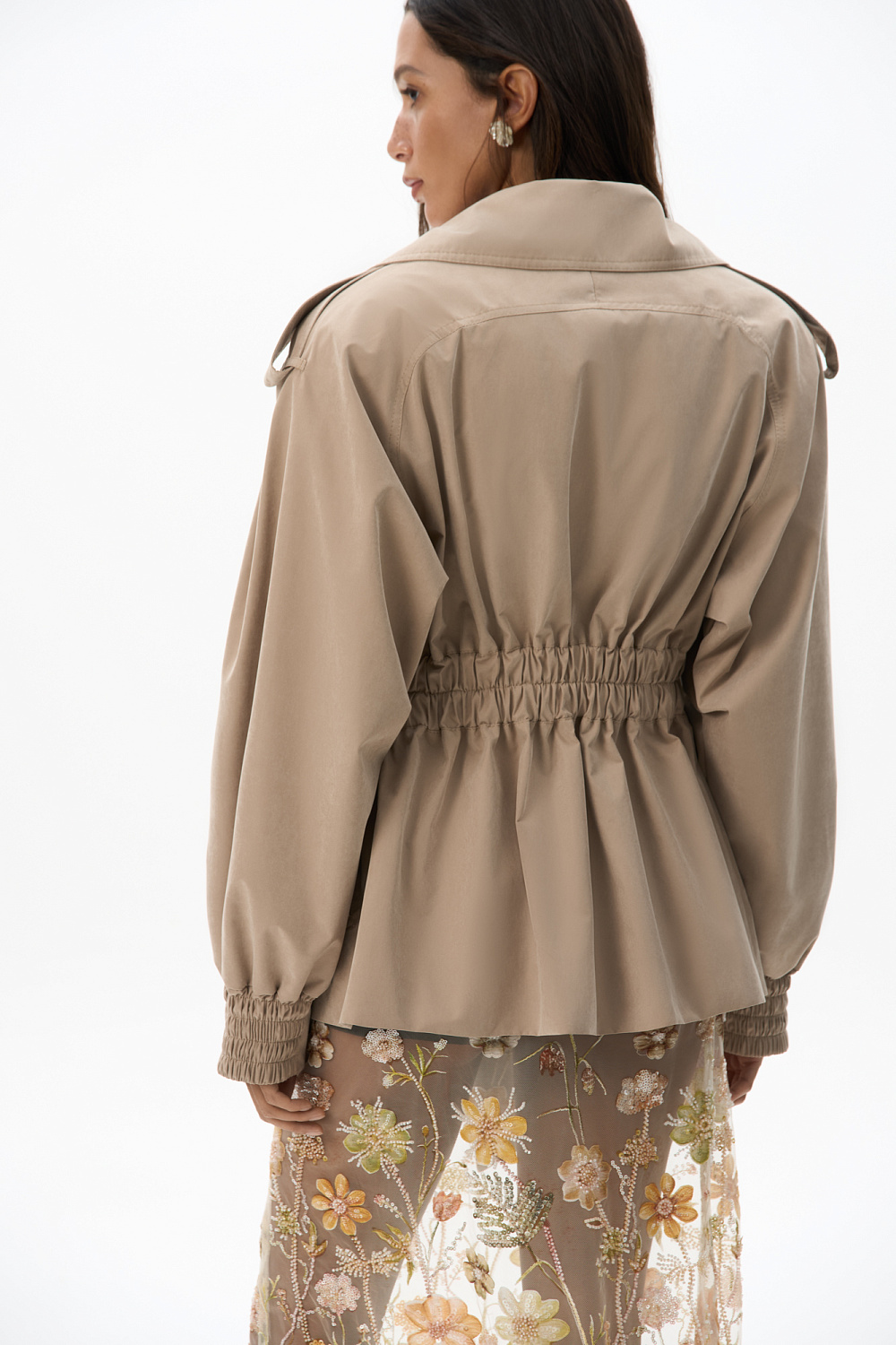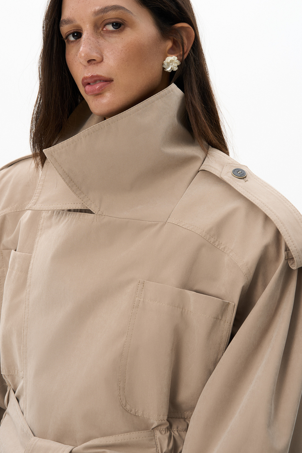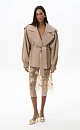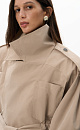 Short trench coat with complex geometry. Model with a wide turn-down collar, loose sleeves with dropped shoulders, elasticated cuffs, chest pockets and a wide elasticated waist, complemented by a belt. The product is lined.