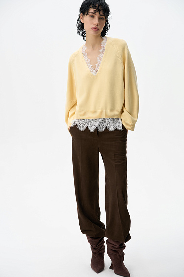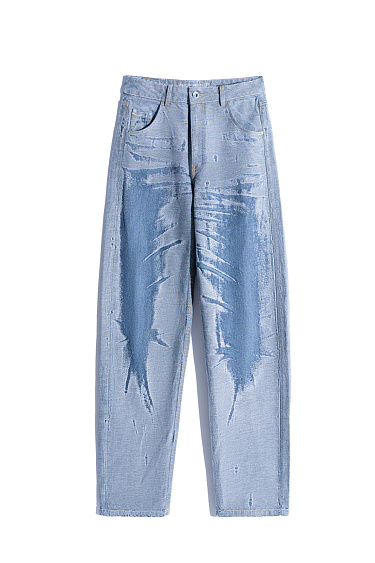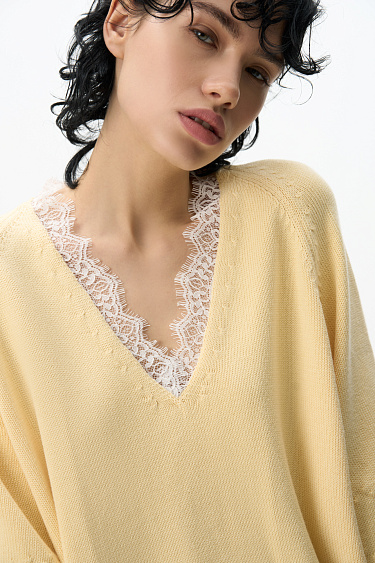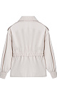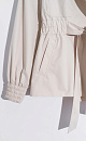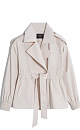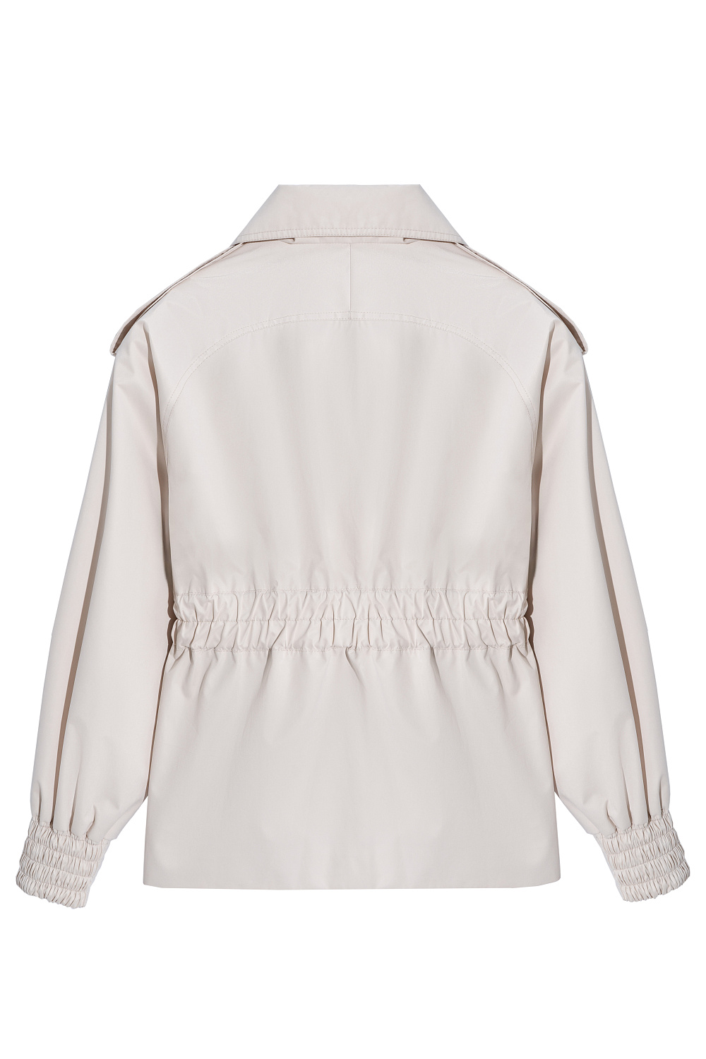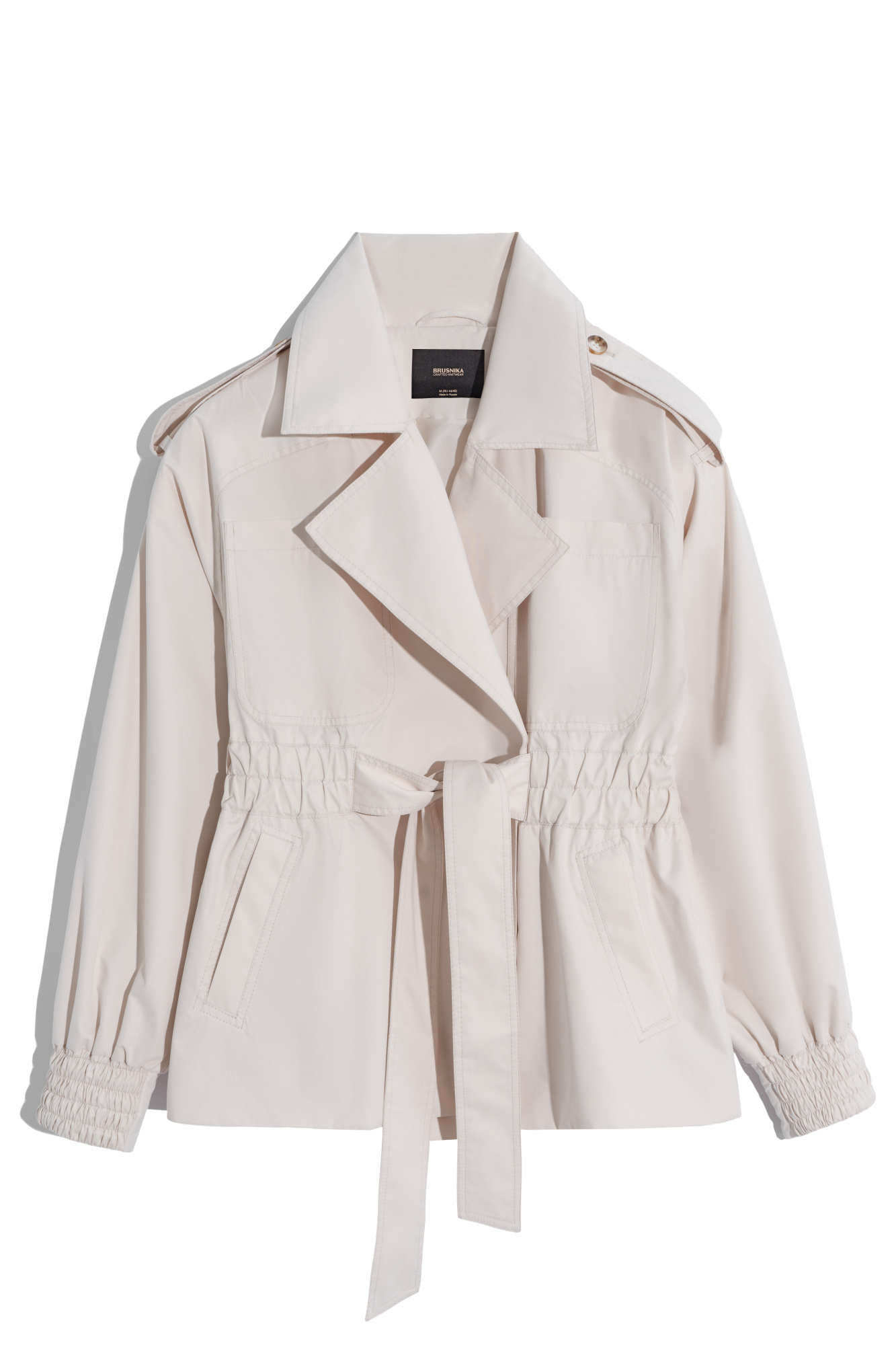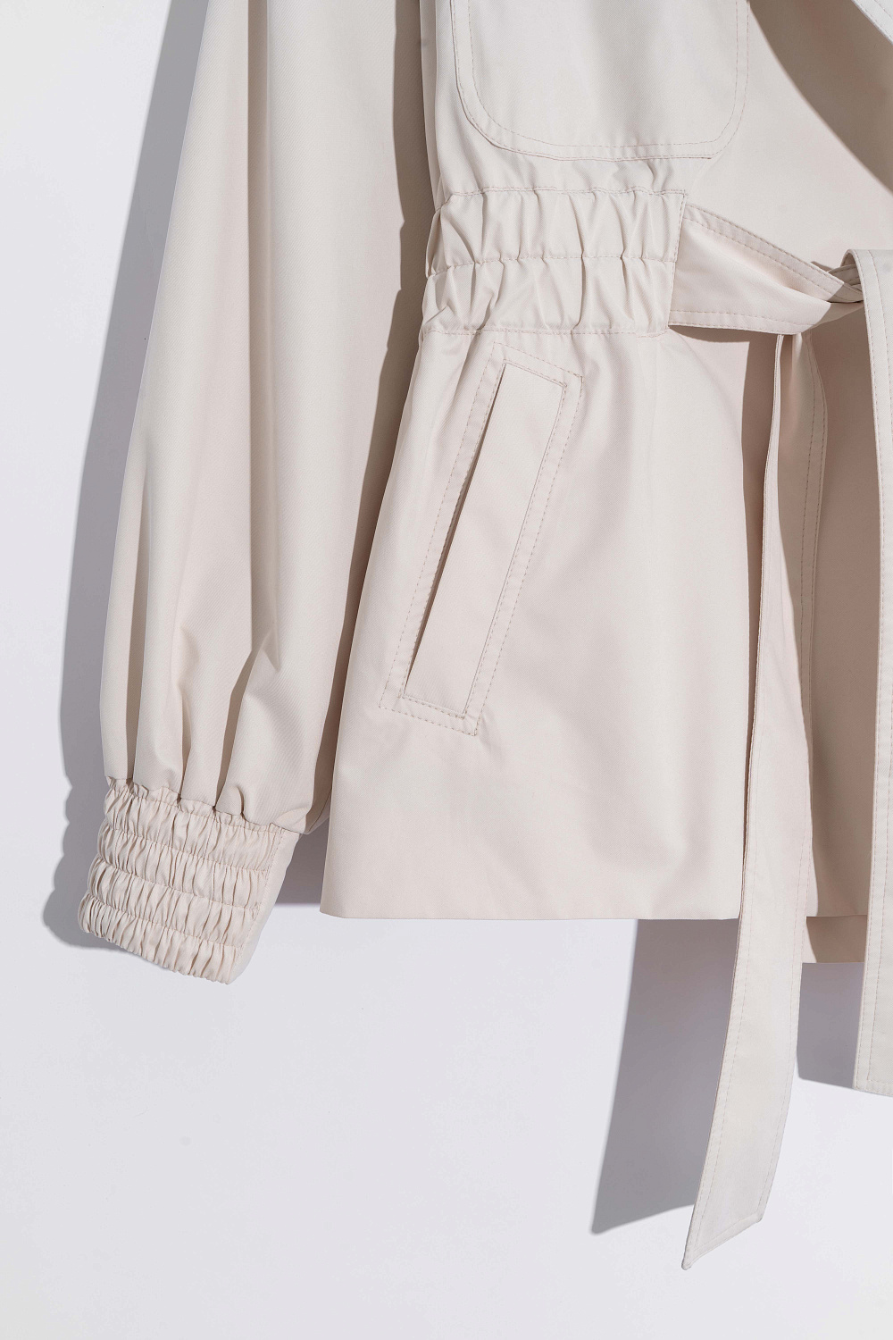Short trench coat with complex geometry. Model with a wide turn-down collar, loose sleeves with dropped shoulders, elasticated cuffs, chest pockets and a wide elasticated waist, complemented by a belt. The product is lined.
