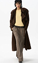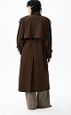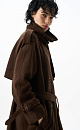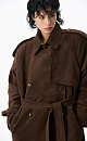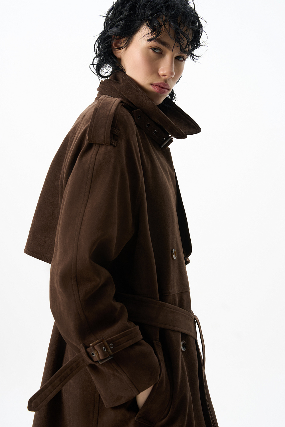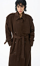 Double-breasted long trench coat, made of fabric with an imitation of the appearance and properties of natural suede.