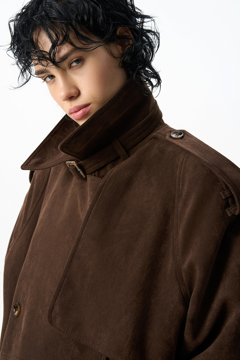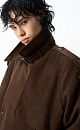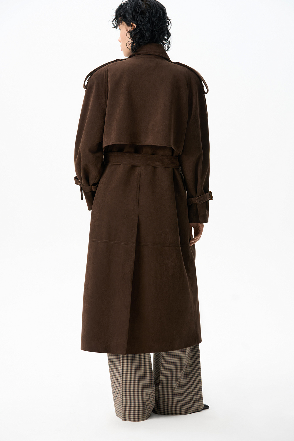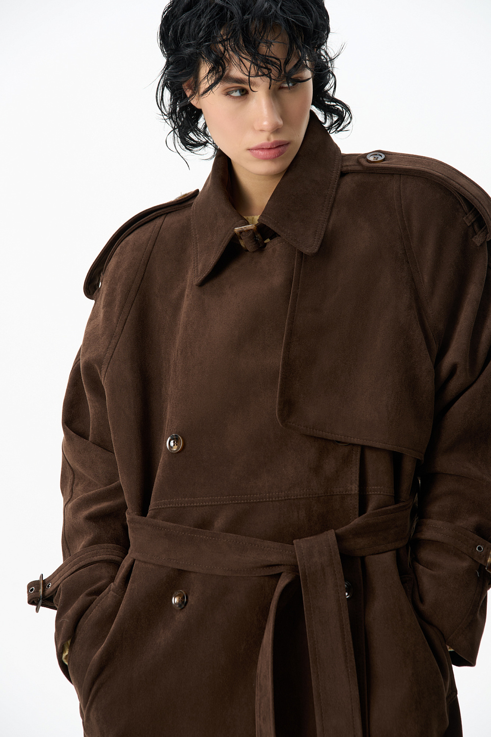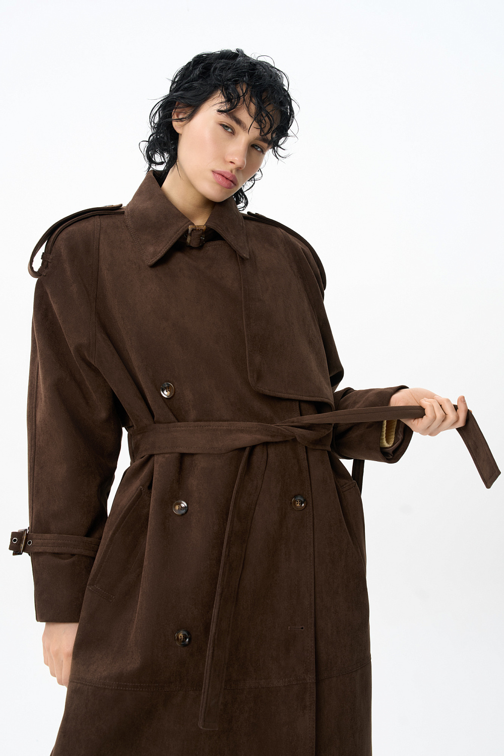 Double-breasted suede trench coat