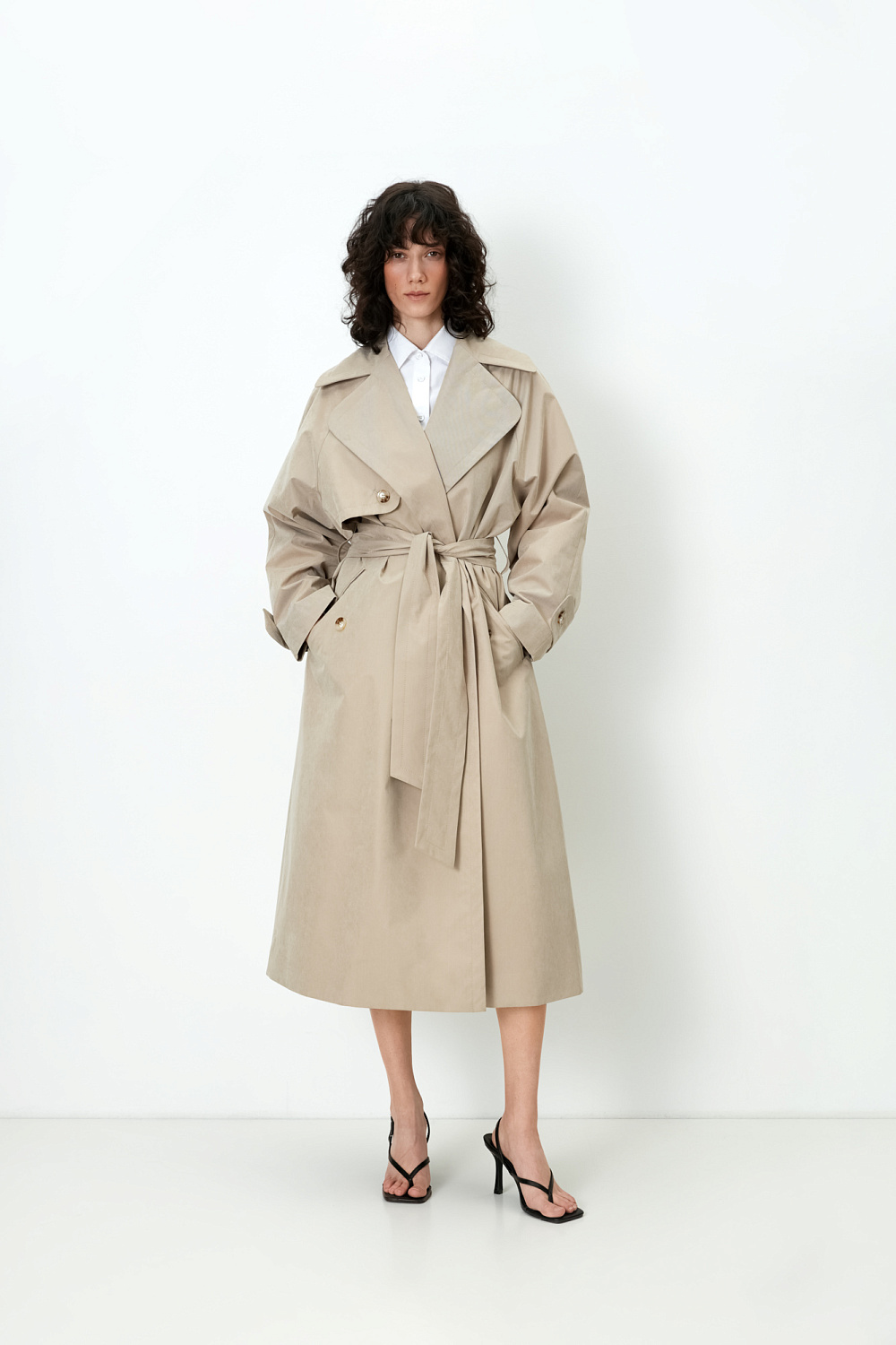 Wrap trench coat made in water-resistant textile. Features loose fit silhouette, tied self belt and long sleeves with belted cuffs.