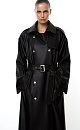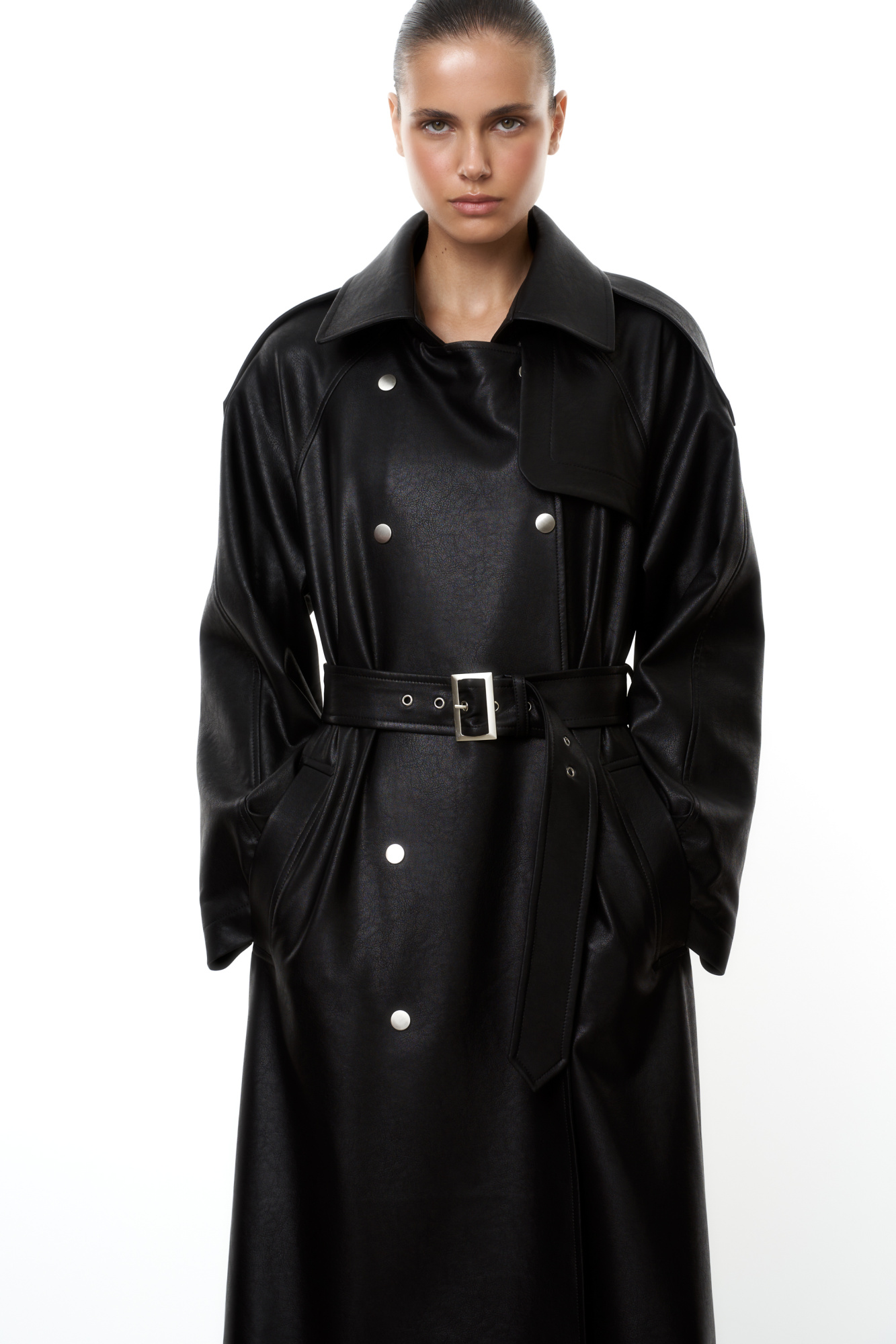 Faux leather trench coat. Loose silhouette with side pockets and long sleeves. Detachable tie belt. The collar and belt are fastened with a metal buckle. Lined.