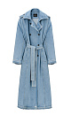 Double-breasted oversized wrap denim trench coat with raw edges. Asymmetrical yoke, turn-down collar. Detachable tie belt at the waist, side pockets. Unlined.