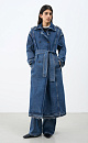 Double-breasted oversized wrap denim trench coat with raw edges. Asymmetrical yoke, turn-down collar. Detachable tie belt at the waist, side pockets. Unlined.